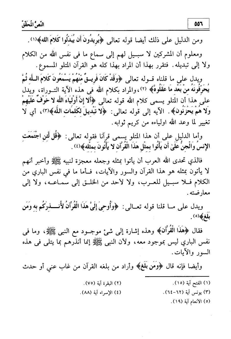 ويدل على ما قلناه قوله تعالى {وَقَدْ كَانَ فَرِيقٌ مِنْهُمْ يَسْمَعُونَ كَلامَ اللَّهِ ثُمَّ يُحَرِّفُونَهُ مِنْ بَعْدِ مَا عَقَلُوه} 2، والمراد بكلام اله في هذه الآية التوراة، ويدل على هذا أن المتلو يسمى كلام الله قوله تعالى: {أَلا إِنَّ أَوْلِيَاءَ اللَّهِ لا خَوْفٌ عَلَيْهِمْ وَلا هُمْ يَحْزَنُونَ} . الآية إلى قوله تعالى: {لا تَبْدِيلَ لِكَلِمَاتِ اللَّهِ} 3، أي لا تغيير لما وعد الله أولياءه من كريم ثوابه.