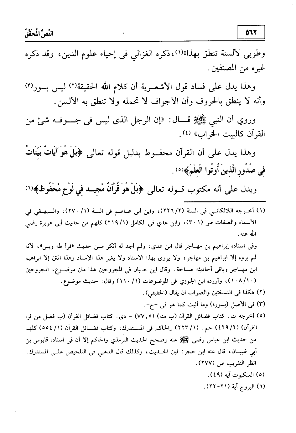 وهذا يدل على فساد قول الأشعرية أن كلام الله الحقيقة2 ليس بسور3 وأنه لا ينطق بالحروف وأن الأجواف لا تحمله ولا تنطق به الألسن.