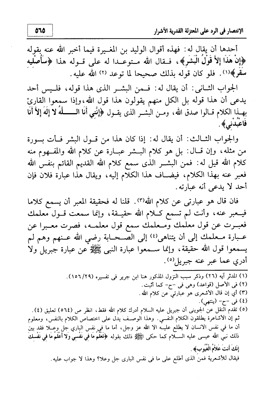 أحدها: أن يقال له: فهذه أقوال الوليد بن المغيرة فيما أخبر الله عنه بقوله: {إِنْ هَذَا إِلاّ قَوْلُ الْبَشَرِ} ، فقال الله متوعداً له على قوله هذا {سَأُصْلِيهِ سَقَرَ} 1. فلو كان قوله بذلك صحيحاً لما توعد2 الله عليه.