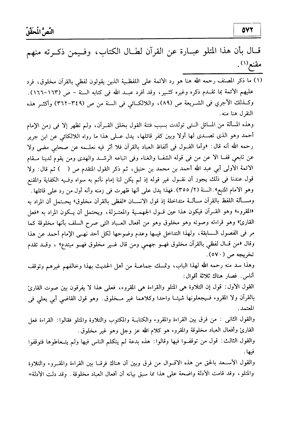 1 ما ذكر المصنف - رحمه الله - هنا هو رد على اللفظية الذين يقولون لفظي بالقرآن مخلوق، فرد عليهم الأئمة بما تقدم ذكره وغيره كثير، وقد أفرد عبد الله في كتابه السنة ص 163-166. وكذلك الآجري في الشريعة ص 89، واللالكائي في السنة من ص 349- 362 وأكثر هذه النقول هنا منه.