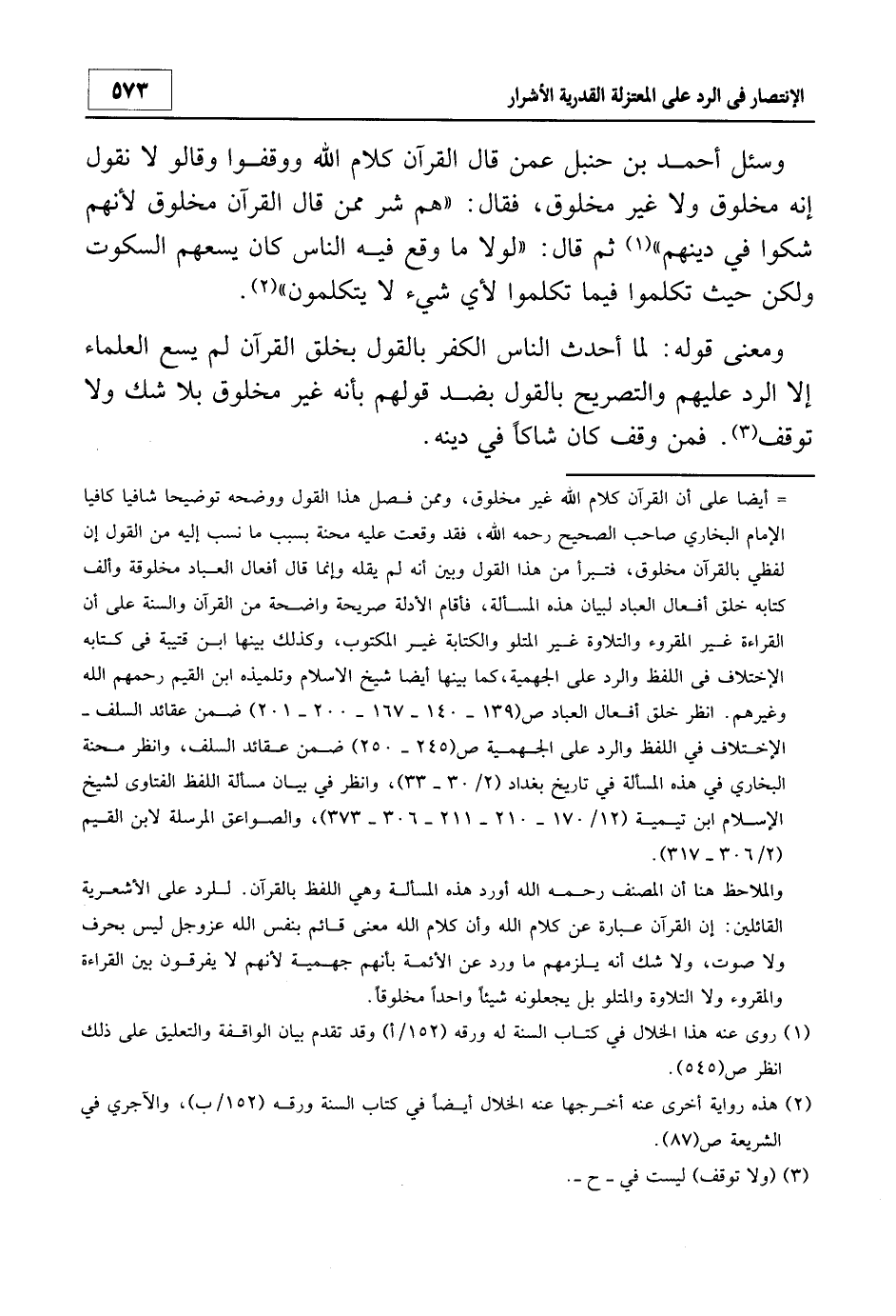 ومعنى قوله: لما أحدث الناس الكفر بالقول بحلق القرآن لم يسع العلماء إلا الرد عليهم والتصريح بالقول بضد قولهم بأنه غير مخلوق بلا شك ولا توقف3. فمن وقف كان شاكاً في دينه.