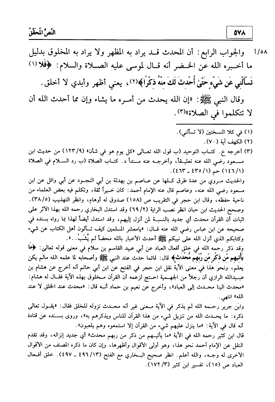 والجواب الرابع: أن المحدث قد يراد به المظهر ولا يراد به المخلوق بدليل ما أخبر الله عن الخضر أنه قال لموسى عليه الصلاة والسلام: {فَلا1 تَسْأَلْنِي عَنْ شَيْءٍ حَتَّى أُحْدِثَ لَكَ مِنْهُ ذِكْراً} 2 يعني أظهر وأبدي لا أخلق.