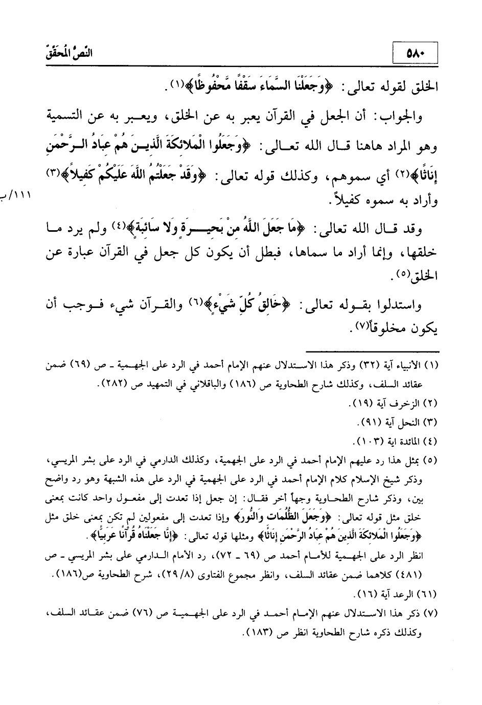 5 بمثل هذا رد عليهم الإمام احم في الرد على الجهمية، وكذلك الدارمي في الرد على بشر المريسي، وذكر شيخ الإسلام كلام الإمام أحمد في الرد على الجهمية في الرد على هذه الشبهة وهو رد واضح بيِّن، وذكر شارح الطحاوية وجهاً آخر فقال: "إن جعل إذا تعدت إلى مفعول واحد كانت بمعنى خلق مثل قوله تعالى: {وَجَعَلَ الظُّلُمَاتِ وَالنُّورَ} وإذا تعدت إلى مفعولين لم تكن بمعنى خلق مثل {وَجَعَلُوا الْمَلائِكَةَ الَّذِينَ هُمْ عِبَادُ الرَّحْمَنِ إِنَاثاً} ومثلها قوله تعالى: {إِنَّا جَعَلْنَاهُ قُرْآناً عَرَبِيّاً} .