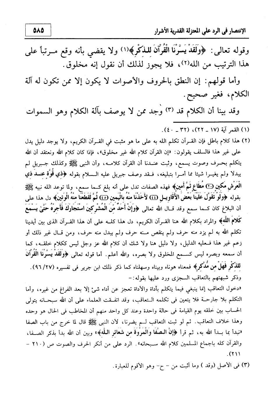 وقوله تعالى: {وَلَقَدْ يَسَّرْنَا الْقُرْآنَ لِلذِّكْرِ} 1 ولا يقضي بأنه وقع مرتباً على هذا الترتيب من الله2، فلا يجوز لذلك أن نقول إنه مخلوق.