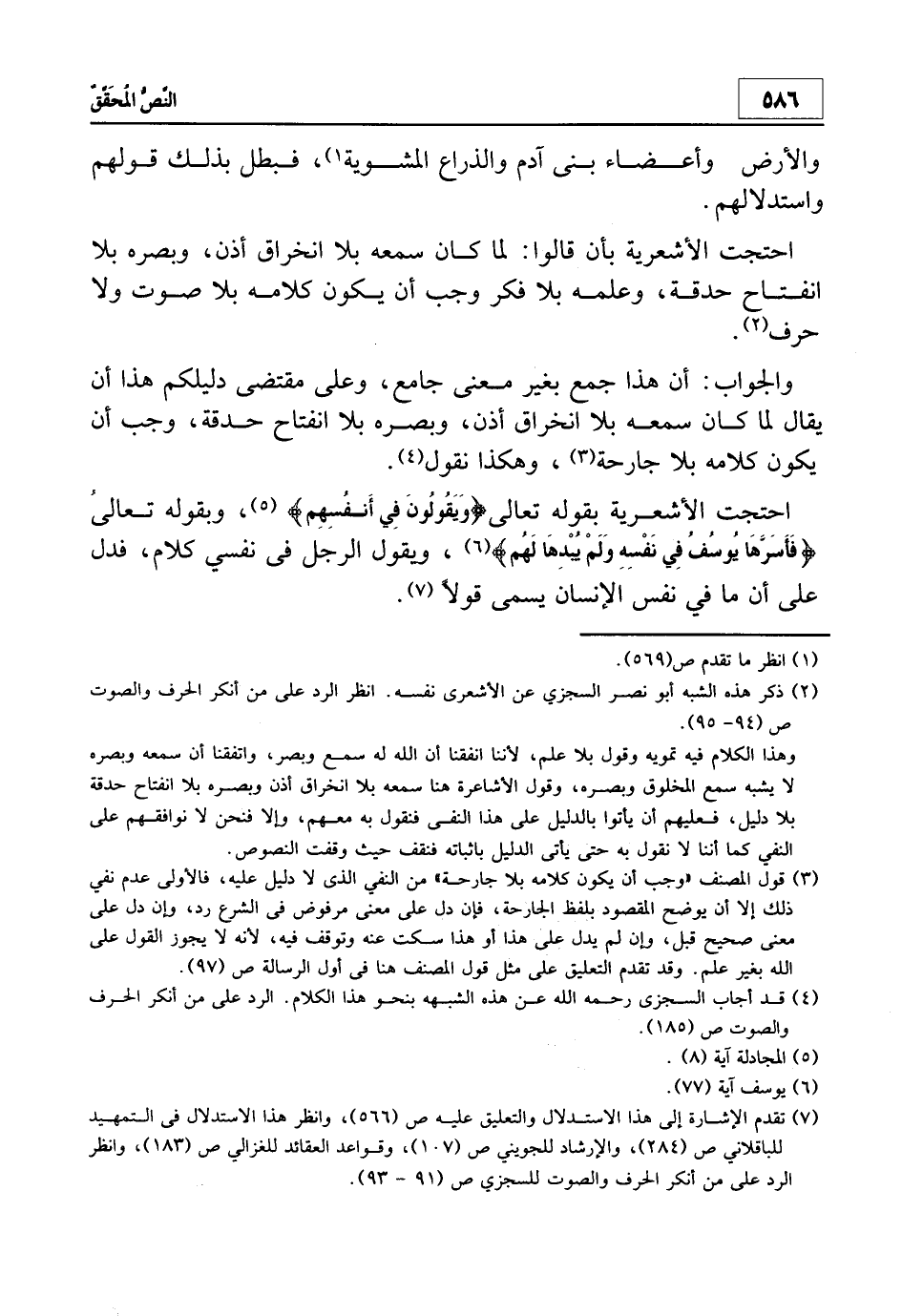 7 تقدمت الإشارة إلى هذا الاستدلال والتعليق عليه ص 566، وانظر هذا الاستدلال في التمهيد للباقلاني ص 284، والإرشاد للجويني ص 107، وقواعد العقائد للغزالي ص 183، وانظر الرد على من أنكر الحرف والصوت للسجزي ص 91- 93.