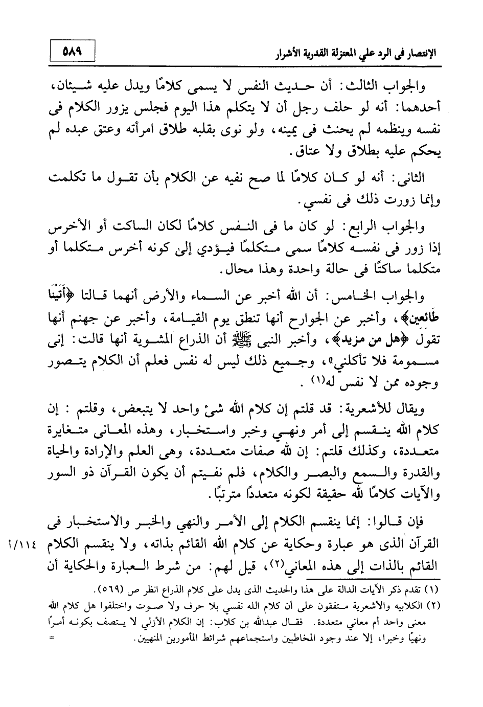 فإن قالوا إنما ينقسم الكلام إلى الأمر والنهي والخبر والاستخبار في القرآن الذي هو عبارة وحكاية عن كلام الله القائم بذاته، ولا ينقسم الكلام القائم بالذات إلى هذه المعاني2، قيل لهم: من شرط العبارة والحكاية أن