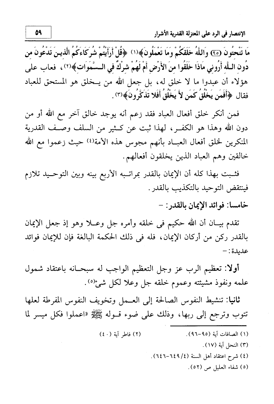 فمن أنكر خلق أفعال العباد فقد زعم أنه يوجد خالق آخر مع الله أو من دون الله وهذا هو الكفر، لهذا ثبت عن كثير من السلف وصف القدرية المنكرين لخلق أفعال العباد بأنهم مجوس هذه الأمة4 حيث زعموا مع الله خالقين وهم العباد الذين يخلقون أفعالهم.
