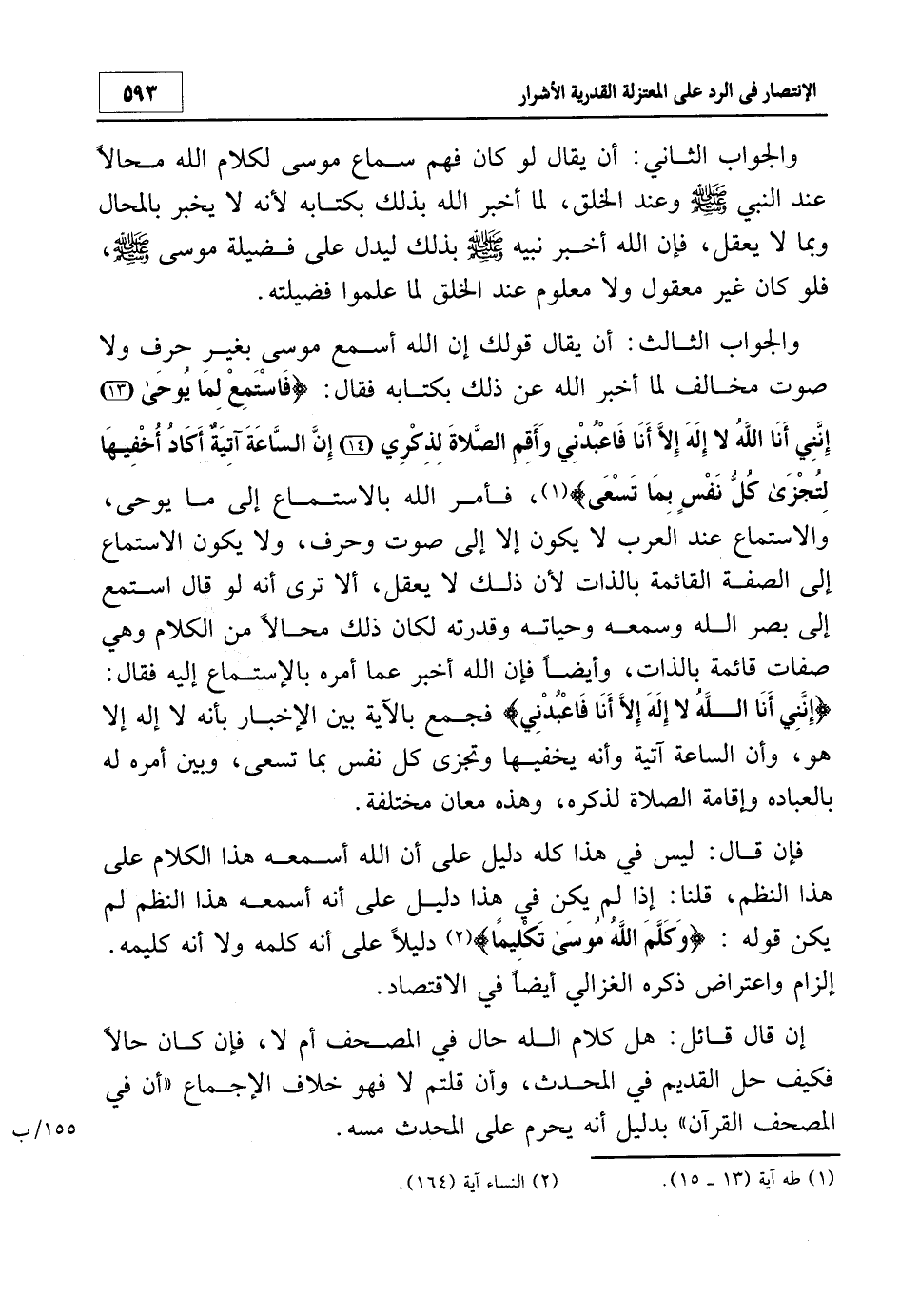 فإن قال: ليس في هذا كله دليل على أن الله أسمعه هذا الكلام على هذا النظم، قلنا: إذا لم يكن في هذا دليل على أنه أسمعه هذا النظم لم يكن قوله: {وَكَلَّمَ اللَّهُ مُوسَى تَكْلِيماً} 2 دليلاً على أنه كلمه ولا أنه كليمه. إلزام واعتراض ذكره الغزالي أيضاً في الاقتصاد.