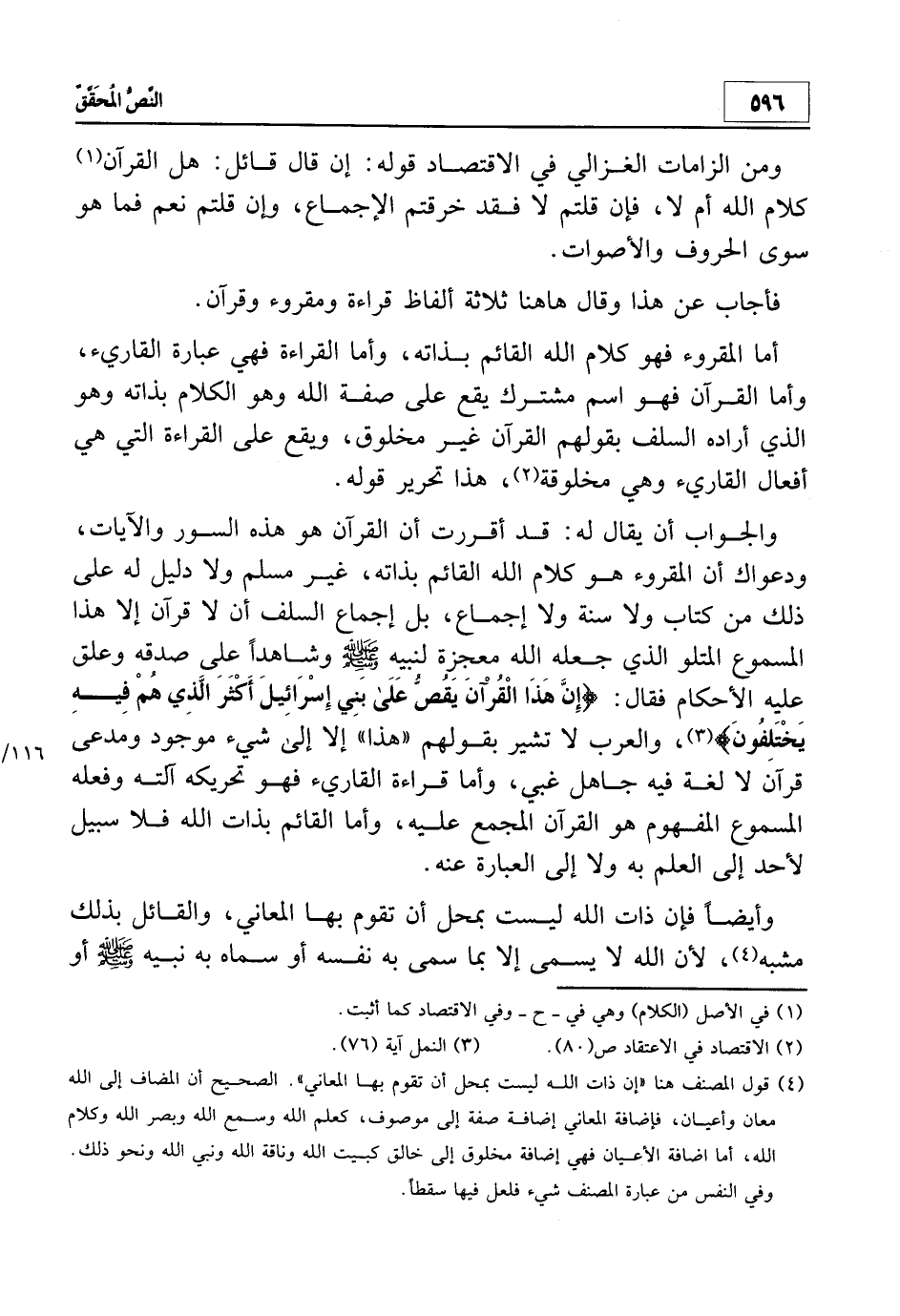 ومن إلزامات الغزالي في الاقتصاد قوله: إن قال قائل هل القرآن1 كلام الله أم لا، فإن قلتم لا فقد خرقتم الإجماع، وإن قلتم نعم فما هو سوى الحروف والأصوات.