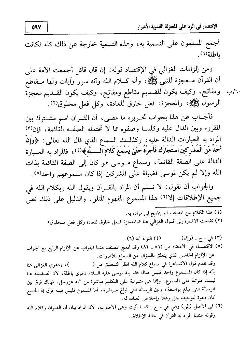 5 الاقتصاد في الاعتقاد ص 81- 82 وقد أدمج المصنف هنا الجواب عن الالتزام الرابع مع الجواب عن الإلزام الخامس الذي يتعلق بالسؤال عن السماع للأصوات.