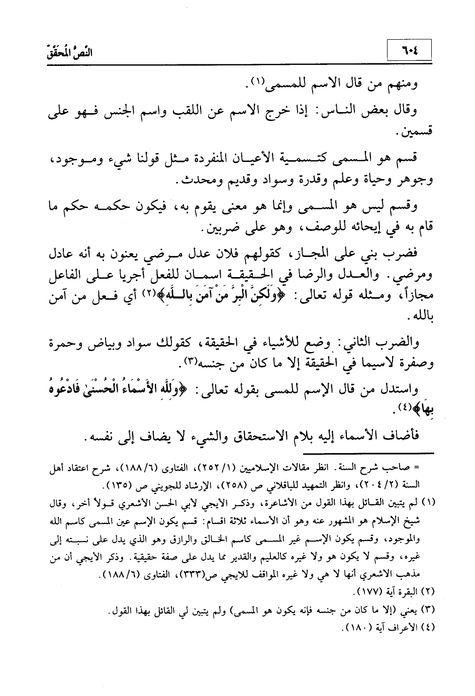 1 لم يتبين القائل بهذا القول من الأشاعرة، وذكر الإيجي لأبي الحسن الأشعري قولاً آخر، وقال شيخ الإسلام: "هو المشهور عنه وهو أن الأسماء ثلاثة أقسام: قسم يكون الاسم عين المسمى كاسم الله والموجود، وقسم يمون الاسم غير المسمى كاسم الخالق والرازق وهو الذي يدل على نسبته إلى غيره، وقسم لا يكون هو ولا غيره كالعليم والقدير مما يدل على صفة حقيقية. وذكر الإيجي أن من مذهب الأشعري أنها لا هي ولا غيره". المواقف للإيجي ص 333، الفتاوى 6/188.