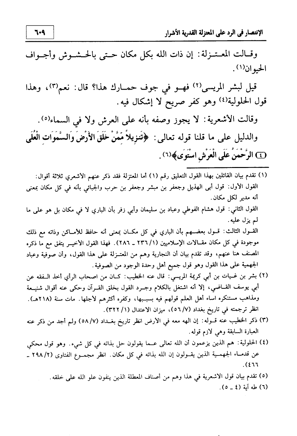 قيل لبشر المريسي2 فهو في جوف حمارك هذا؟ قال: نعم3، وهذا قول الحلولية4 وهو كفر صريح لا إشكال فيه.