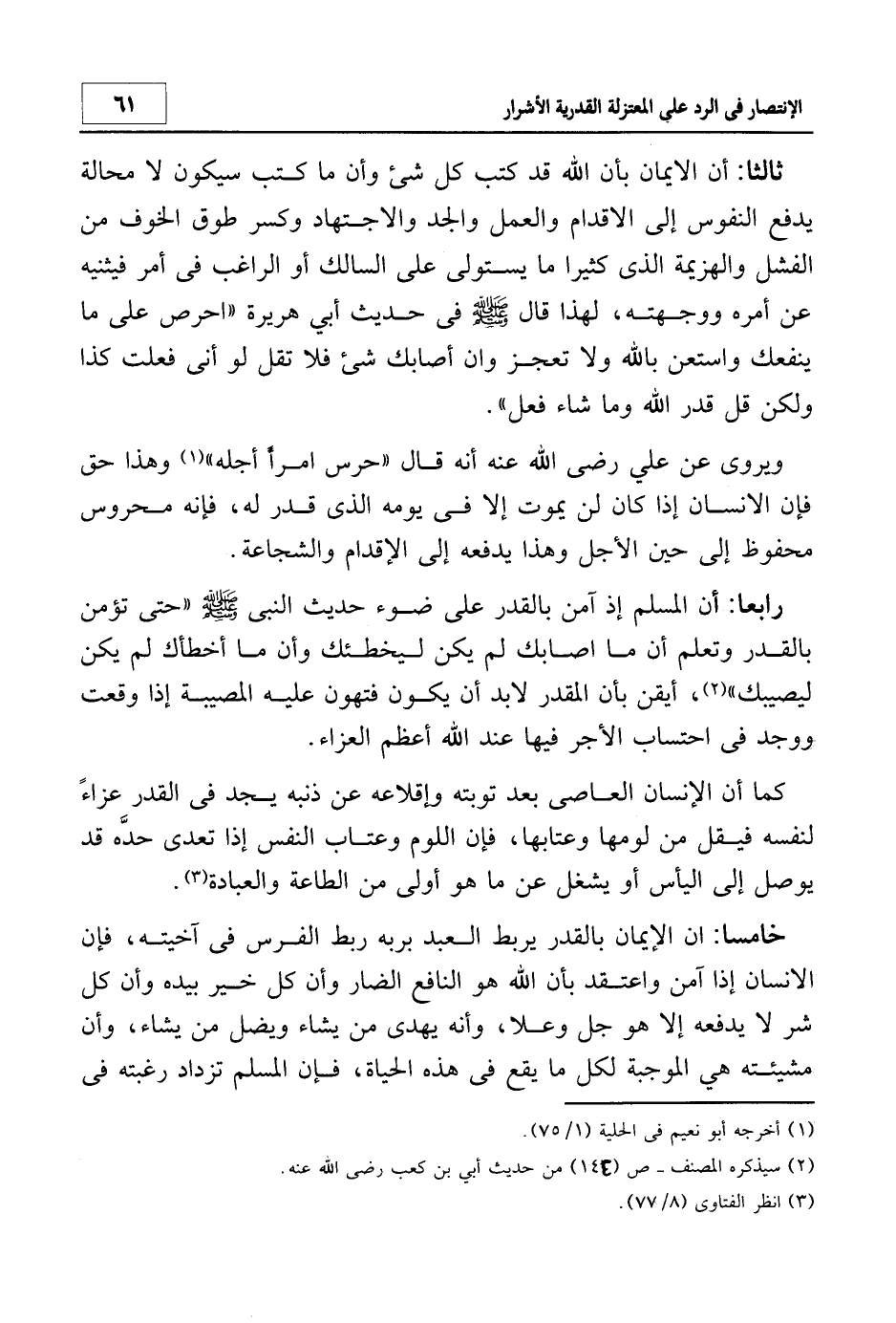 ثالثا: أن الإيمان بأن الله قد كتب كل شيء وأن ما كتب سيكون لا محالة يدفع النفوس إلى الإقدام والعمل والجد والاجتهاد وكسر طوق الخوف من الفشل والهزيمة الذي كثيرا ما يستولي على السالك أو الراغب في أمر فيثنيه عن أمره ووجهته، لهذا قال - صلى الله عليه وسلم- في حديث أبي هريرة: "احرص على ما ينفعك واستعن بالله ولا تعجز وإن أصابك شيء فلا تقل لو أني فعلت كذا ولكن قل قدر الله وما شاء فعل".