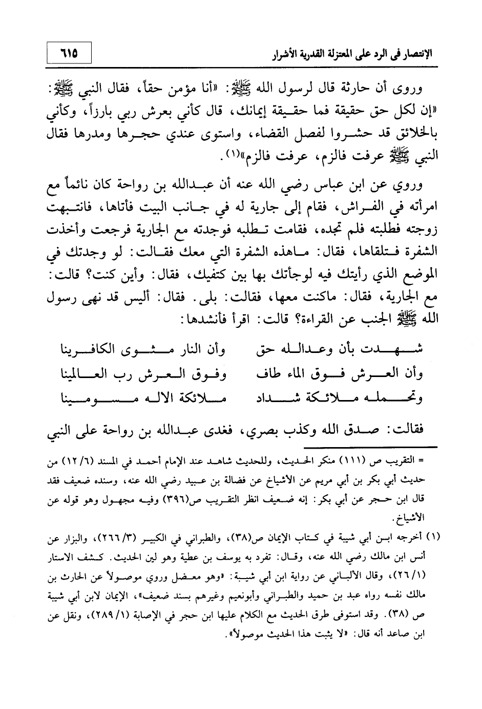 1 أخرجه ابن أبي شيبة في كتاب الإيمان ص 38، والطبراني في الكبير 3/266، والبزار عن أنس بن مالك - رضي الله عنه -، وقال: تفرد به يوسف بن عطية وهو لين الحديث. كشف الأستار 1/26، وقال الألباني عن رواية ابن أبي شيبة: "وهو معضل وروي موصولاً عن الحارث بن مالك نفسه رواه عبد بن حميد والطبراني وأبو نعيم وغيرهم بسند ضعيف". الإيمان لابن أبي شيبة ص 38. وقد استوفى طرق الحديث مع الكلام عليها ابن حجر في الإصابة 1/289، ونقل عن ابن صاعد أنه قال: "لا يثبت هذا الحديث موصولاً".
