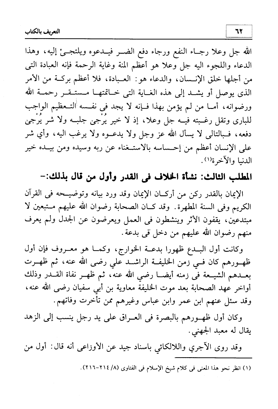 الإيمان بالقدر ركن من أركان الإيمان وقد ورد بيانه وتوضيحه في القرآن الكريم وفي السنة المطهرة. وقد كان الصحابة رضوان الله عليهم متبعين لا مبتدعين، يقفون الأثر وينشطون في العمل ويعرضون عن الجدل ولم يعرف منهم رضوان الله عليهم من دخل في بدعة.