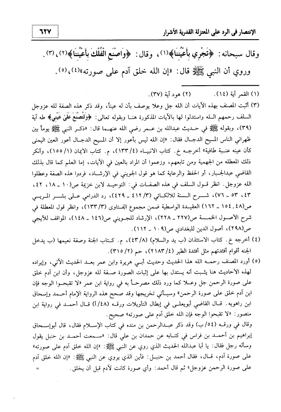 5 أورد المصنف - رحمه الله - هذا الحديث وحديث أبي هريرة وابن عمر بعد الحديث الآتي، وإيراده لهذه الأحاديث هنا يثبت أنه يستدل بها على إثبات الصورة لله عزوجل، وأن ابن آدم خلق على صورة الرحمن جل وعلا كما ورد ذلك مصرحاً به في رواية ابن عمر: "لا تقبحوا الوجه فإن ابن آدم خلق على صورة الرحمن" وسيأتي تخريجها وقد صحح هذه الرواية الإمام أحمد وإسحاق بن راهويه. قال القاضي أبو يعلى في إبطال التأويلات ورقة 48/أقال أحمد في رواية ابن منصور: "لا تقبحوا الوجه فإن الله خلق آدم على صورته" صحيح.