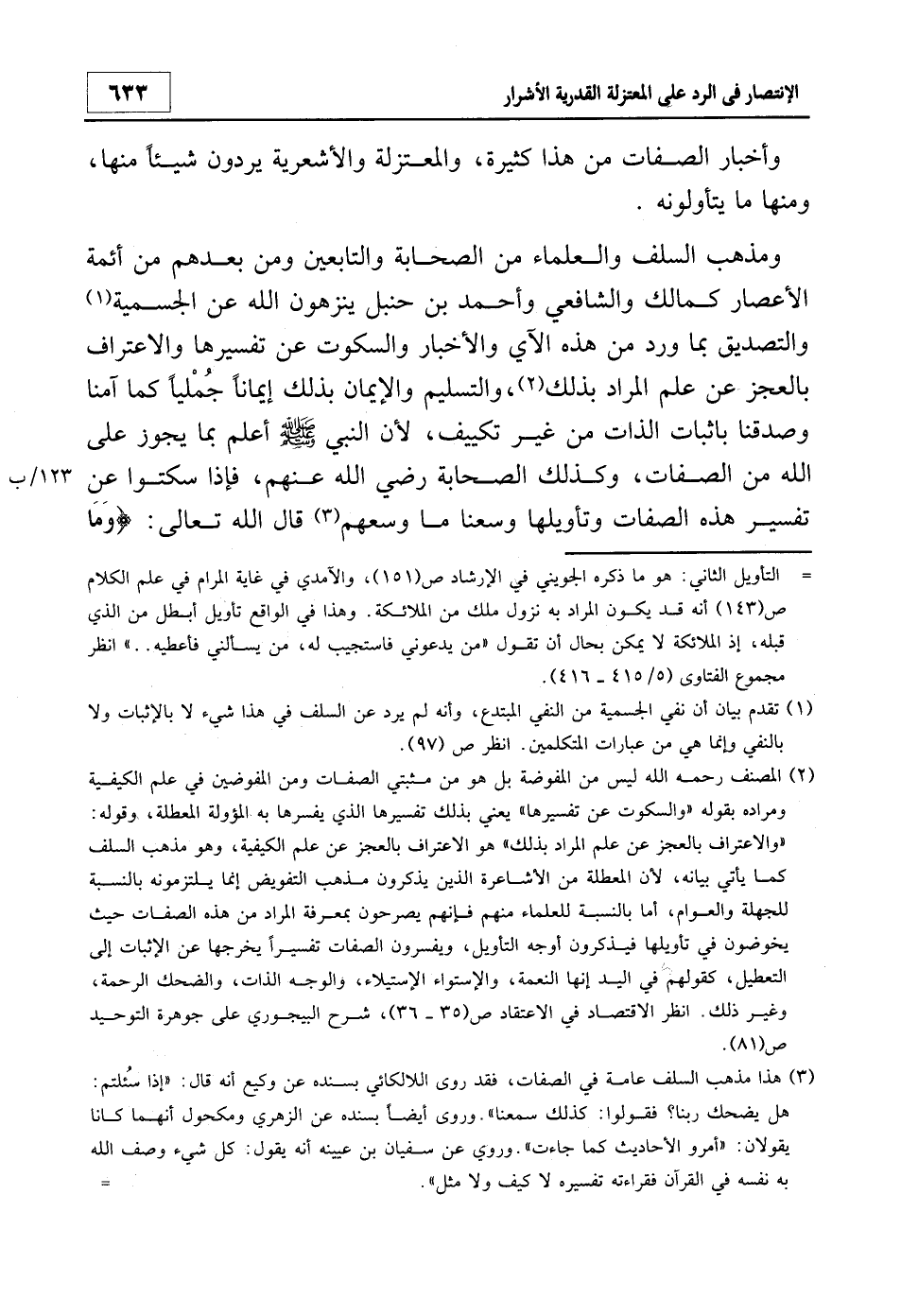 2 المصنف - رحمه الله - ليس من المفوضة بل هو من مثبتي الصفات ومن المفوضين في علم الكيفية ومراده بقوله "والسكوت عن تفسيرها" يعني بذلك تفسيرها الذي يفسر به المؤولة والمعطلة، وقوله: "والاعتراف بالعجز عن علم المراد بذلك" هو الاعتراف بالعجز عن علم الكيفية، وهو مذهب السلف كما يأتي بيانه، لأن المعطلة من الأشاعرة الذين يذكرون مذهب التفويض إنما يلتزمونه بالنسبة للجهلة والعوام، أما بالنسبة للعلماء منهم فإنهم يصرحون بمعرفة المراد من هذه الصفات حيث يخوضون في تأويلها فيذكرون أوجه التأويل، ويفسرون الصفات تفسيراً يخرجها عن الإثبات إلى التعطيل، كقولهم في اليد إنها النعمة، والاستواء الاستيلاء، والوجه الذات، والضحك الرحمة، وغير ذلك. انظر: الاقتصاد في الاعتقاد ص 35- 36، شرح البيجوري على جوهرة التوحيد ص81.