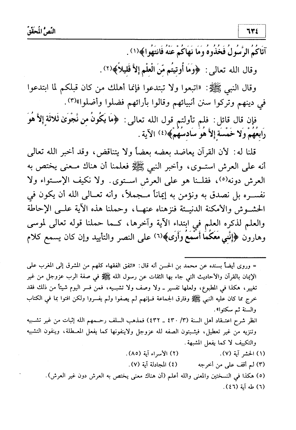 قلنا له: لأن القرآن يعاضد بعضه بعضاً ولا يتناقض، وقد أخبر الله تعالى أنه على العرش استوى، وأخبر النبي صلى الله عليه وسلم فعلمنا أن هناك معنى يختص به العرش دونه5، فقلنا هو على العرش استوى. ولا نكيف الاستواء ولا نفسره بل نصدق به ونؤمن به إيماناً مجملاً، وأنه تعالى الله أن يكون في الحشوش والأمكنة الدنيئة فنزهناه عنها، وحملنا هذه الآية على الإحاطة والعلم لذكره العلم في ابتداء الآية وآخرها، كما حملنا قوله تعالى لموسى وهارون: {إِنَّنِي مَعَكُمَا أَسْمَعُ وَأَرَى} 6 على النصر والتأييد وإن كان يسمع كلام