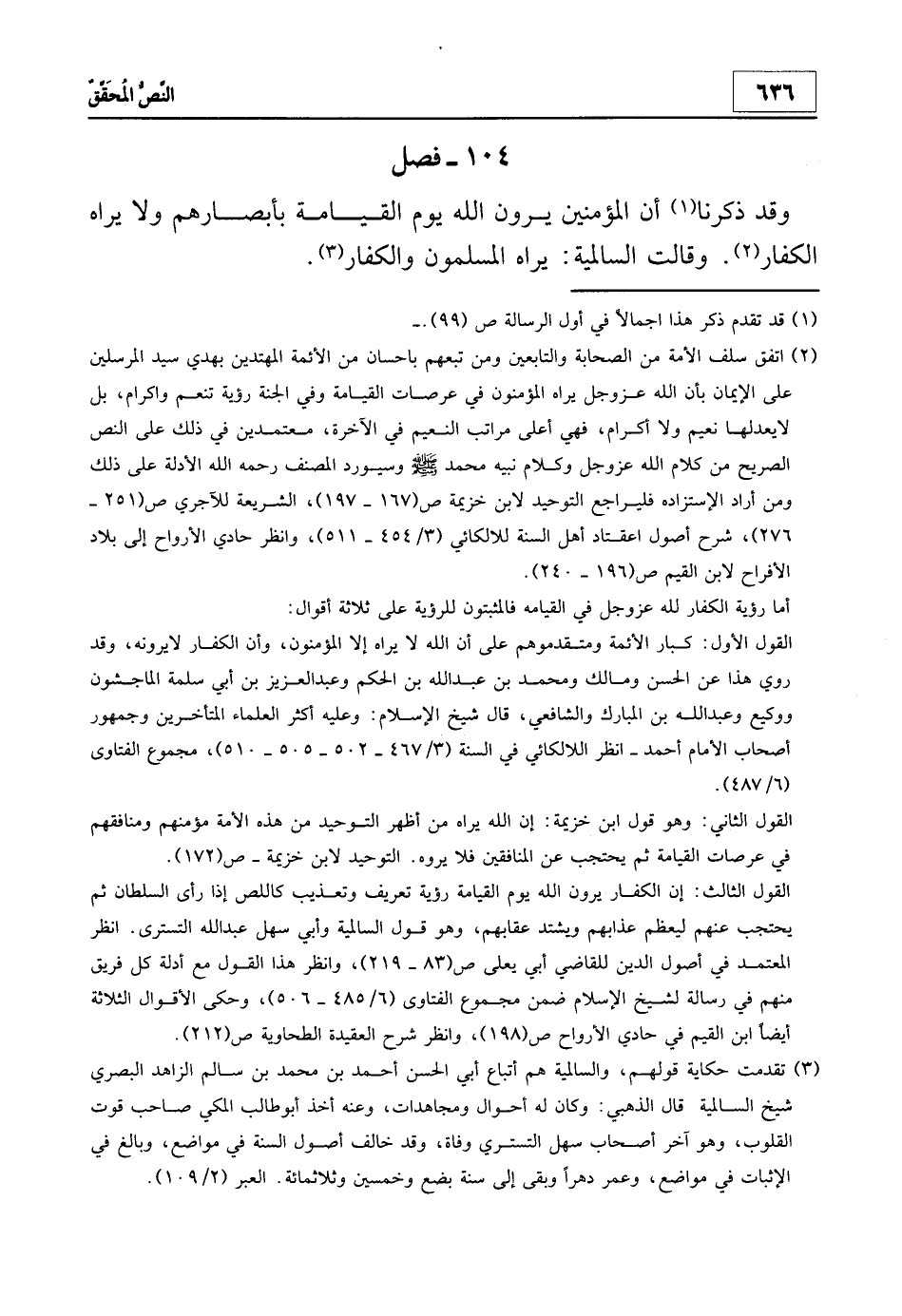 2 اتفق سلف الأمة من الصحابة والتابعين ومن تبعهم بإحسان من الأئمة المهتدين بهدي سيد المرسلين على الإيمان بأن الله عزوجل يراه المؤمنون في عرصات القيامة وفي الجنة رؤية تنعم وإكرام، بل لا يعدلها نعيم ولا إكرام، فهي أعلى مراتب النعيم في الآخرة، معتمدين في ذلك على النص الصريح من كلام الله عزوجل وكلام نبيه محمد صلى الله عليه وسلم وسيورد المصنف - رحمه الله - الأدلة على ذلك ومن أراد الاستزادة فليراجع التوحيد لابن خزيمة ص 167-197، الشريعة للآجري ص 251- 276، شرح اصول اعتقاد أهل السنة للالكائي 3/45- 511، وانظر: حادي الأرواح إلى بلاد الأفراج لابن القيم ص 196- 240.