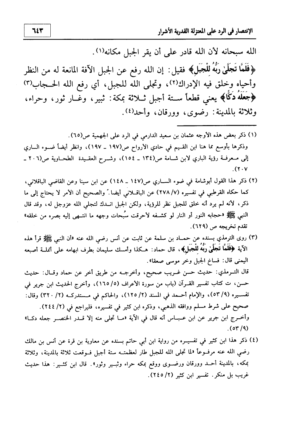 2 ذكر هذا القول أبو شامة في ضوء الساري ص 147 - 148 عن ابن سينا وعن القاضي الباقلاني، كما حكاه القرطبي في تفسيره 7/278 عن الباقلاني أيضاً. والصحيح أن الأمر لا يحتاج إلى ما ذكر، لأنه لم يرد أنه خلق للجبل نظر رؤية، ولكن الجبل اندك لتجلي الله عزوجل له، وقد قال النبي صلى الله عليه وسلم: "حجابه النور أو النار لو كشفه لأحرقت سبحات وجهه ما انتهى إليه بصره من خلقه" تقدم تخريجه ص 629.