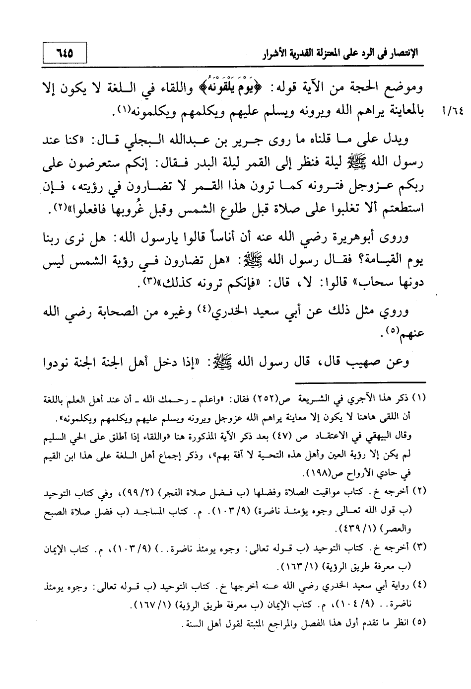 1 ذكر هذا الآجري في الشريعة ص 252 فقال: "واعلم - رحمك الله - أن عند أهل العلم باللغة أن اللقى هاهنا لا يكون إلا معاينة يراهم الله عزوجل ويرونه ويسلم عليهم ويكلمهم ويكلمونه".