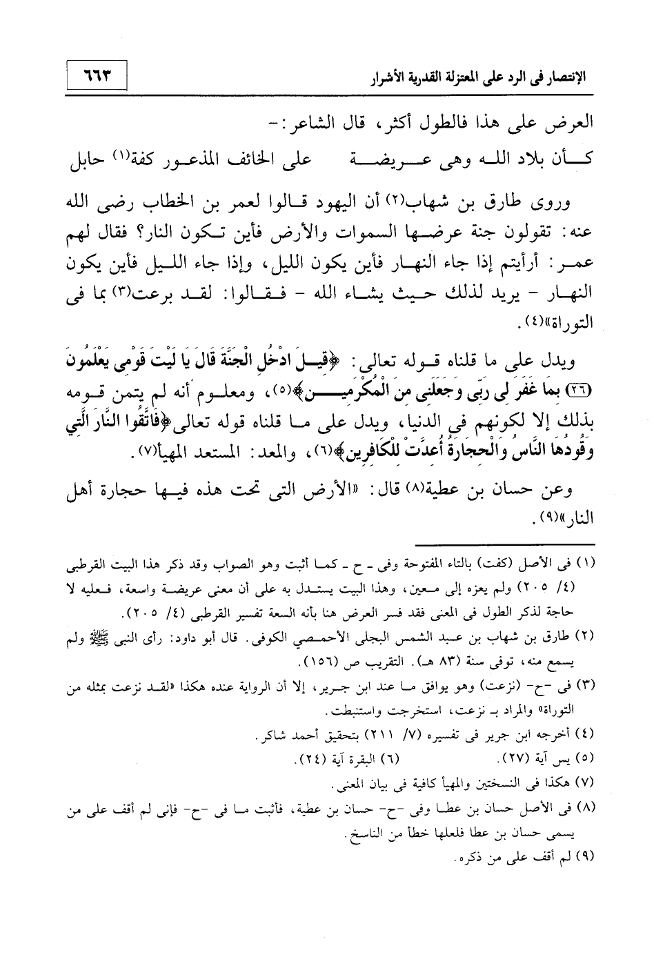 1 في الأصل (كفت) بالتاء المفتوحة وفي - ح - كما أثبت وهو الصواب وقد ذكر هذا البيت القرطبي 4/205 ولم يعزه إلى معين، وهذا البيت يستدل به على أن معنى عريضة واسعة، فعليه لا حاجة لذكر الطول في المعنى فقد فسر العرض هنا بأنه السعة تفسير القرطبي 4/205.