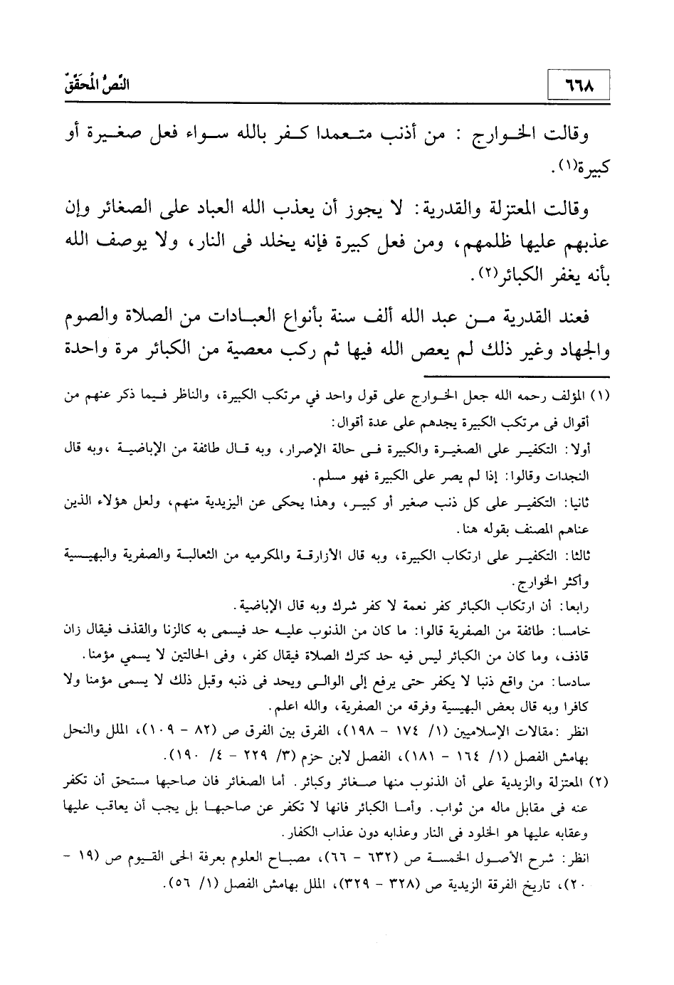 1 المؤلف - رحمه الله - جعل الخوارج على قول واحد في مرتكب الكبيرة، والناظر فيم ذكر عنهم من أقوال في مرتكب الكبيرة يجدهم على عدة أقوال: