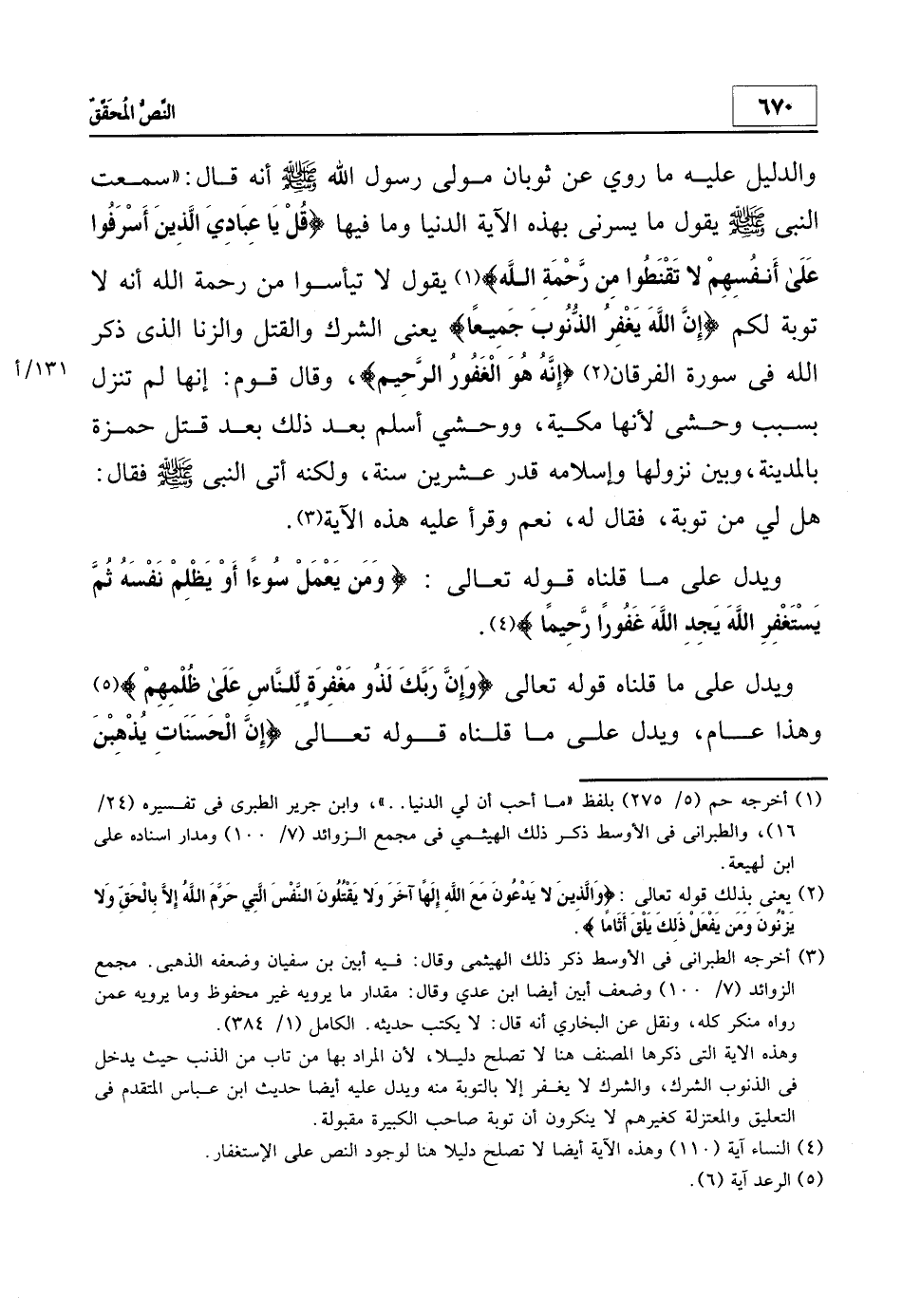 3 أخرجه الطبراني في الأوسط ذكر ذلك الهيثمي وقال: "فيه أبين بن سفيان وضعفه الذهبي". مجمع الزوائد 7/100 وضعف أبين أيضا ابن عدي وقال: "مقدار ما يرويه غير محفوظ وما يرويه عمن رواه منكر كله، ونقل عن البخاري أنه قال: لا يكتب حديثه. الكامل 1/384.وهذه الآية التي ذكرها المصنف هنا لا تصلح دليلا، لأن المراد بها من تاب من الذنب حيث يدخل في الذنوب الشرك، والشرك لا يغفر إلا بالتوبة منه ويدل عليه أيضا حديث ابن عباس المتقدم في التعليق والمعتزلة كغيرهم لا ينكرون أن توبة صاحب الكبيرة مقبولة.