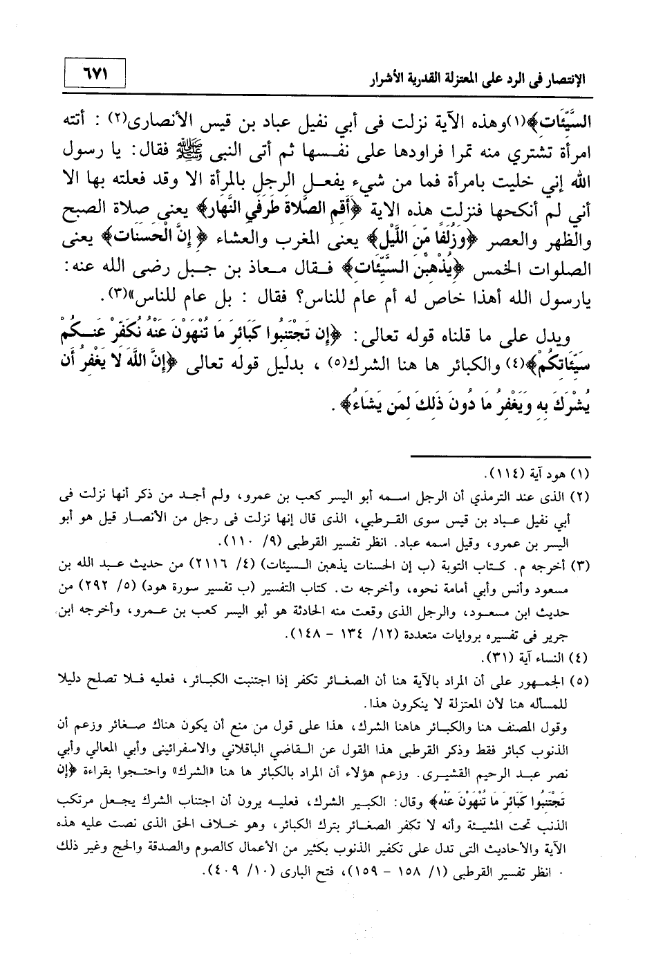 5 الجمهور على أن المراد بالآية هنا أن الصغائر تكفر إذا اجتنبت الكبائر، فعليه فلا تصلح دليلا للمسألة هنا، لأن المعتزلة لا ينكرون هذا. وقول المصنف هنا والكبائر هاهنا الشرك، هذا يدل على قول من منع أن يكون هناك صغائر وزعم أن الذنوب كبائر فقط وذكر القرطبي هذا القول عن القاضي الباقلاني والإسفرائيني وأبي المعالي وأبي نصر عبد الرحيم القشيري. وزعم هؤلاء أن المراد بالكبائر ها هنا (الشرك) واحتجوا بقراءة {إِنْ تَجْتَنِبُوا كَبَائِرَ مَا تُنْهَوْنَ عَنْهُ} وقال عنه: الكبير الشرك، فعليه يرون أن اجتناب الشرك يجعل مرتكب الذنب تحت المشيئة وأنه لا تكفر الصغائر بترك الكبائر، وهو خلاف الحق الذي نصت عليه هذه الآية والأحاديث التي تدل على تكفير الذنوب بكثير من الأعمال كالصوم والصدقة والحج وغير ذلك. انظر: تفسير القرطبي 1/158 - 159، فتح الباري 10/409.