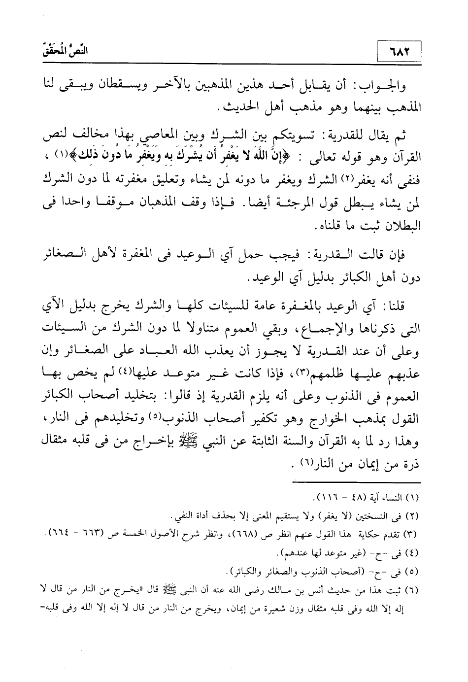 ثم يقال للقدرية: تسويتكم بين الشرك وبين المعاصي بهذا مخالف لنص القرآن وهو قوله تعالى: {إِنَّ اللَّهَ لا يَغْفِرُ أَنْ يُشْرَكَ بِهِ وَيَغْفِرُ مَا دُونَ ذَلِكَ لِمَنْ يَشَاءُ} 1، فنفى أنه يغفر2الشرك ويغفر ما دونه لمن يشاء وتعليق مغفرته لما دون الشرك لمن يشاء يبطل قول المرجئة أيضا. فإذا وقف المذهبان موقفا واحدا في البطلان ثبت ما قلناه.