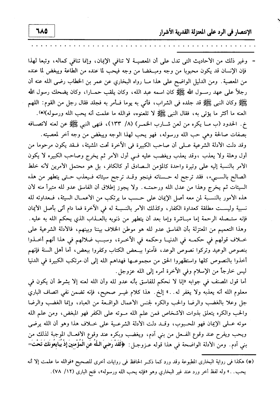 وغير ذلك من الأحاديث التي تدل على أن المعصية لا تنافي الإيمان، وإنما تنافي كماله، وتبعا لهذا فإن الإنسان قد يكون محبوبا من وجه ومبغضا من وجه فيحب لما عنده من الطاعة ويبغض لما عنده من المعصية. ومن الدليل الواضح على هذا ما رواه البخاري عن عمر بن الخطاب - رضي الله عنه - أن رجلاً على عهد رسول الله صلى الله عليه وسلم كان اسمه عبد الله، وكان يلقب حمارا، وكان يضحك رسول الله صلى الله عليه وسلم قد جلده في الشراب، فأتي به يوما فأمر به فجلد فقال رجل من القوم: اللهم إلعنه ما أكثر ما يؤتى به، فقال النبي صلى الله عليه وسلم:" لا تلعنوه، فوالله ما علمت أنه يحب الله ورسوله". هكذا ورد في رواية البخاري المطبوع وقد ورد كما ذكر الحافظ في روايات أخرى للصحيح "فول الله ما علمت إلا أنه يحب …" وله لفظ آخر ورد عند غير البخاري وهو " فإنه يحب الله ورسوله ". فتح الباري 12/78. خ. الحدود (ب ما يكره من لعن شارب الخمر) 8/133، فنهى النبي صلى الله عليه وسلم عن لعنه لاتصافه بصفات صالحة وهي حب الله ورسوله، فهو يحب لهذا الوجه ويبغض من وجه آخر لمعصيته.