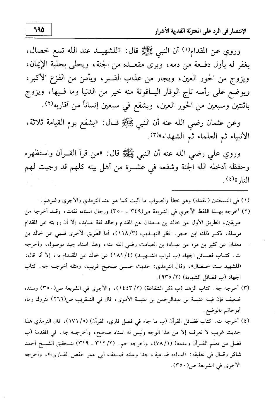 2 أخرجه بهذا اللفظ الآجري في الشريعة ص 349 - 350 ورجال إسناده ثقات، وقد أخرجه من طريقين، الطريق الأول عن خالد بن معدان عن المقدام وخالد ثقة عابد، إلا أن روايته عن المقدام مرسلة، ذكر ابن حجر. انظر: التهذيب 3/118، أما الطريق الأخرى فهي عن خالد بن معدان عن كثير بن مرة عن عبادة بن الصامت - رضي الله عنه - وهذا إسناد جيد موسول، وأخرجه ت. كتاب فضائل الجهاد (ب ثواب الشهيد) 4/181 عن خالد عن المقدام به، إلا أنه قال: "للشهيد ست خصال"، وقال الترمذي: "حديث صحيح غريب"، ومثله أخرجه جه. كتاب الجهاد (ب فضائل الشهادة) 2/935.