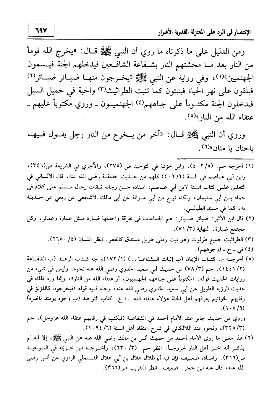 ومن الدليل على ما ذكرناه ما روي أن النبي صلى الله عليه وسلم قل: "يخرج الله قوماً من النار بعد ما محشتهم النار بشفاعة الشافعين فيدخلهم الجنة فيسمون الجهنميين"1، وفي رواية عن النبي صلى الله عليه وسلم "يخرجون منها ضبائر ضبائر2فيلقون على نهر الحياة فينبتون كما تنبت الطراثيث3 والحبة في حميل السيل فيدخلون الجنة مكتوباً على جباههم4 الجهنميون - وروي مكتوباً عليهم - عتقاء الله من النار"5.
