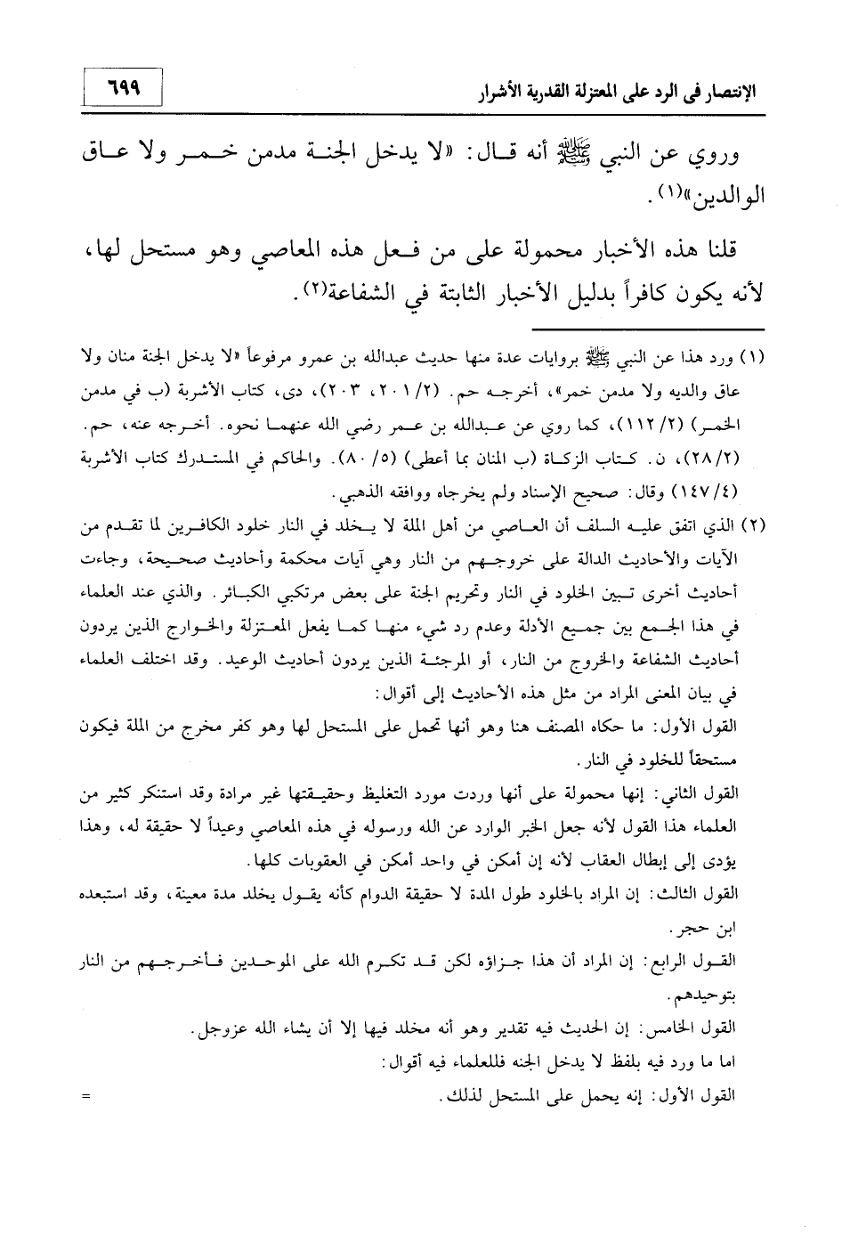 وأرجح هذه الأقوال هو قول من قال إنها تحمل على المستحل، أو أنها تحمل على أن هذا عقابه، إلا أن يعفو ويتكرم فيغفر ذلك، أما ما عداها فإن الضعف فيه ظاهر، والله أعلم انظر في هذا: التوحيد لابن خزيمة ص 367 - 373، فتح الباري 3/227، صحيح مسلم بشرح النووي 1/113، 125.