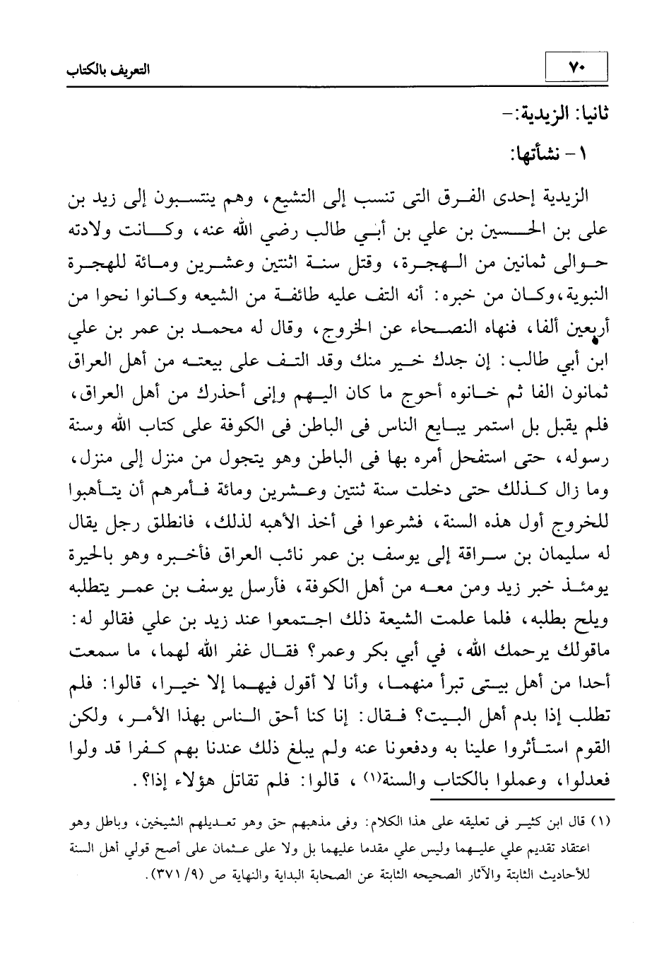 الزيدية إحدى الفرق التي تنسب إلى التشيع، وهم ينتسبون إلى زيد ابن علي بن الحسين بن علي بن أبي طالب - رضي الله عنه -، وكانت ولادته حوالي ثمانين من الهجرة، وقتل سنة اثنتين وعشرين ومائة للهجرة النبوية، وكان من خبره: أنه التف عليه طائفة من الشيعة وكانوا نحوا من أربعين ألفا، فنهاه النصحاء عن الخروج، وقال له محمد بن عمر بن علي بن أبي طالب: إن جدك خير منك وقد التف على بيعته من أهل العراق ثمانون ألفا ثم خانوه أحوج ما كان إليهم وإني أحذرك من أهل العراق، فلم يقبل بل استمر يبايع الناس في الباطن في الكوفة على كتاب الله وسنة رسوله، حتى استفحل أمره بها في الباطن وهو يتجول من منزل إلى منزل، وما زال كذلك حتى دخلت سنة ثنتين وعشرين ومائة فأمرهم أن يتأهبوا للخروج أول هذه السنة، فشرعوا في أخذ الأهبة لذلك، فانطلق رجل يقال له: سليمان بن سراقة إلى يوسف بن عمر نائب العراق فأخبره وهو بالحيرة يومئذ خبر زيد ومن معه من أهل الكوفة، فأرسل يوسف بن عمر يتطلبه ويلح بطلبه، فلما علمت الشيعة ذلك اجتمعوا عند زيد بن علي فقالوا له: ما قولك يرحمك الله، في أبي بكر وعمر؟ فقال: غفر الله لهما، ما سمعت أحدا من أهل بيتي تبرأ منهما، وأنا لا أقول فيهما إلا خيرا، قالوا: فلم تطلب إذاً بدم أهل البيت؟ فقال: إنا كنا أحق الناس بهذا الأمر، ولكن القوم استأثروا علينا به ودفعونا عنه ولم يبلغ ذلك عندنا بهم كفرا قد ولوا فعدلوا، وعملوا بالكتاب والسنة 1، فقالوا: فلم تقاتل هؤلاء إذاً؟