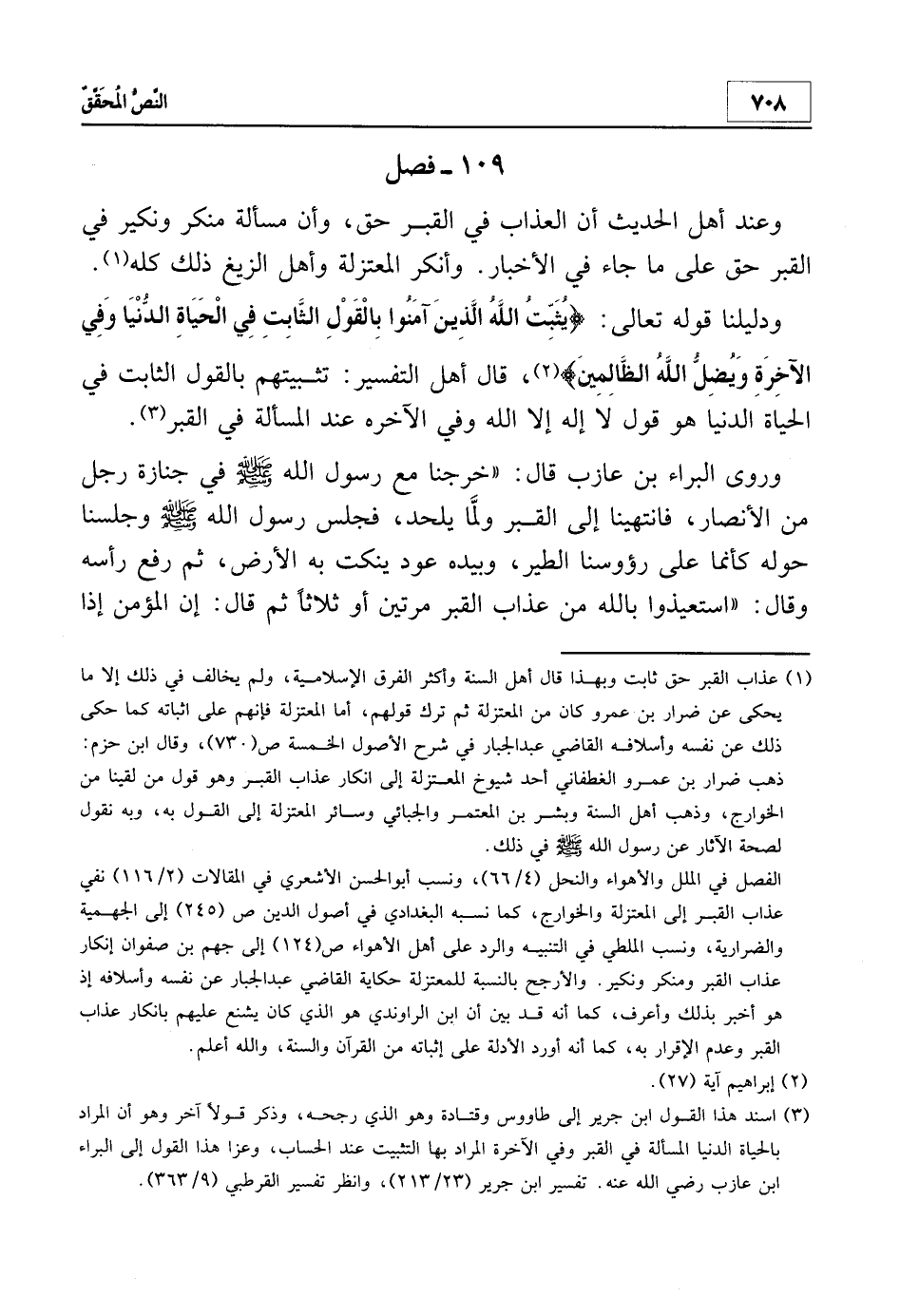 1 عذاب القبر حق ثابت وبهذا قال أهل السنة وأكثر الفرق الإسلامية، ولم يخالف في ذلك إلا ما يحكى عن ضرار بن عمرو كان من المعتزلة ثم ترك قولهم، أما المعتزلة فإنهم على إثباته كما حكى ذلك عن نفسه وأسلافه القاضي عبد الجبار في شرح الأصول الخمسة ص 730، وقال ابن حزم: "ذهب ضرار بن عمرو الغطفاني أحد شيوخ المعتزلة إلى إنكار عذاب القبر وهو قول من لقينا من الخوارج، وذهب أهل السنة وبشر بن المعتزلة والجبائي وسائر المعتزلة إلى القول به، وبه نقول لصحة الآثار عن رسول الله صلى الله عليه وسلم في ذلك". الفصل في الملل والنحل والأهواء 4/66، ونسب أبو الحسن الأشعري في المقالات 2/116 نفي عذاب القبر إلى المعتزلة والخوارج، كما نسبه البغدادي في أصول الدين ص 245 إلى الجهمية والضرارية، ونسب الملطي في التنبيه والرد على أهل الأهواء ص 124 إلى جهم بن صفوان إنكار عذاب القبر ومنكر ونكير. والأرجح بالنسبة للمعتزلة حكاية القاضي عبد الجبار عن نفسه وأسلافه إذ هو أخبر بذلك وأعرف، كما أنه قد بين أن ابن الراوندي هو الذي كان يشنع عليهم إنكار عذاب القبر وعدم الإقرار به، كما أنه أورد الأدلة على إثباته من القرآن والسنة، والله أعلم.