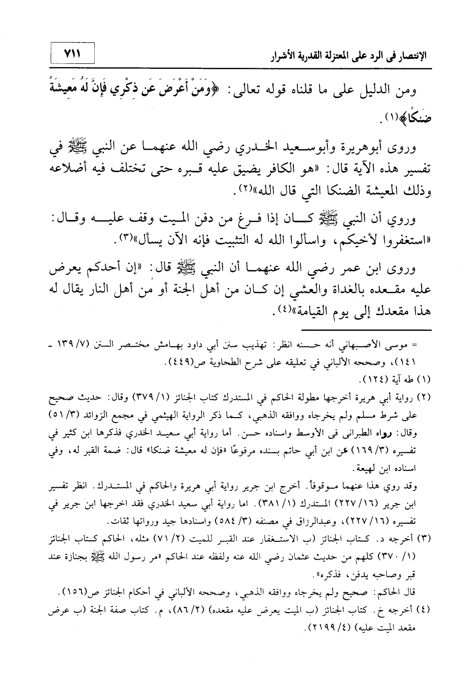 2 رواية أبي هريرة أخرجها مطولة الحاكم في المستدرك كتاب الجنائز 1/379 وقال: "حديث صحيح على شرط مسلم ولم يخرجاه" ووافقه الذهبي، كما ذكر الرواية الهيثمي في مجمع الزوائد 3/51 وقال: "رواه الطبراني في الأوسط وإسناده حسن". أما رواية أبي سعيد الخدري فذكرها ابن كثير في تفسيره 3/169 عن ابن أبي حاتم بسنده مرفوعاً: "فإنه له معيشو ضنكا" قال: "ضمة القبر له"، وفي إسناده ابن لهيعة.