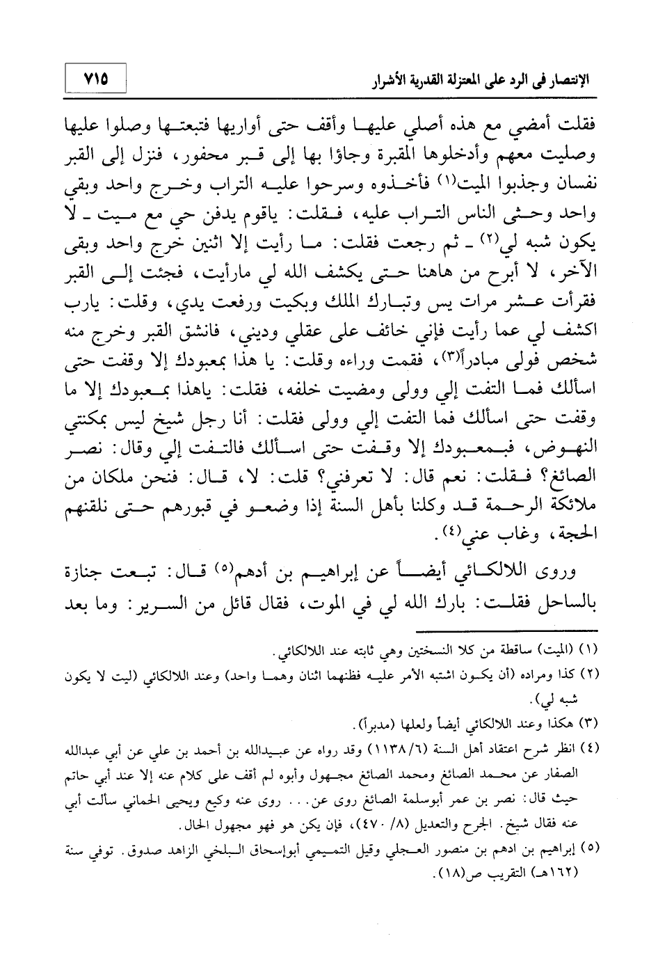 فقلت أمضي مع هذه أصلي عليها وأقف حتى أروايها فتبعها وصلوا عليها وصليت معهم وأدخلوها المقبرة وجاؤا بها إلى قبره محفور، فنزل إلى القبر نفسان وجذبوا الميت1 فأخذوه وسرحوا عليه التراب وخرج واحد وبقي واحد وحثى الناس التراب عليه، فقلت: يا قوم يدفن حي مع ميت - لا يكون شبه لي2 - ثم رجعت فقلت: ما رأيت إلا اثنين خرج واحد وبقي الآخر، لا أبرح من هاهنا حتى يكشف الله لي ما رأيت، فجئت إلى القبر فقرأت عشرات مرات يس وتبارك وبكيت ورفعت يدي، وقلت: يا رب اكشف لي عما رأيت فإني خائف على عقلي وديني، فانشق القبر وخرج منه شخص فولى مبادرا3، فقمت وراءه وقلت: يا هذا بمعبودك إلا وقفت حتى أسألك فما التفت إلي وولى ومضيت خلفه، فقلت: يا هذا بمعبودك إلا ما وقفت حتى أسألك فما التفت إلي وولى فقلت: أنا رجل شيخ ليس بمكنتي النهوض، فبمعبودك إلا وقفت حتى أسألك فالتفت إلي وقال: نصر الصائغ؟ فقلت: نعم قال: لا تعرفني؟ قلت: لا، قال: فنحن ملكان من ملائكة الرحمة قد وكلنا بأهل السنة إذا وضعوا في قبورهم حتى نقلنهم الحجة، وغاب عني"4.