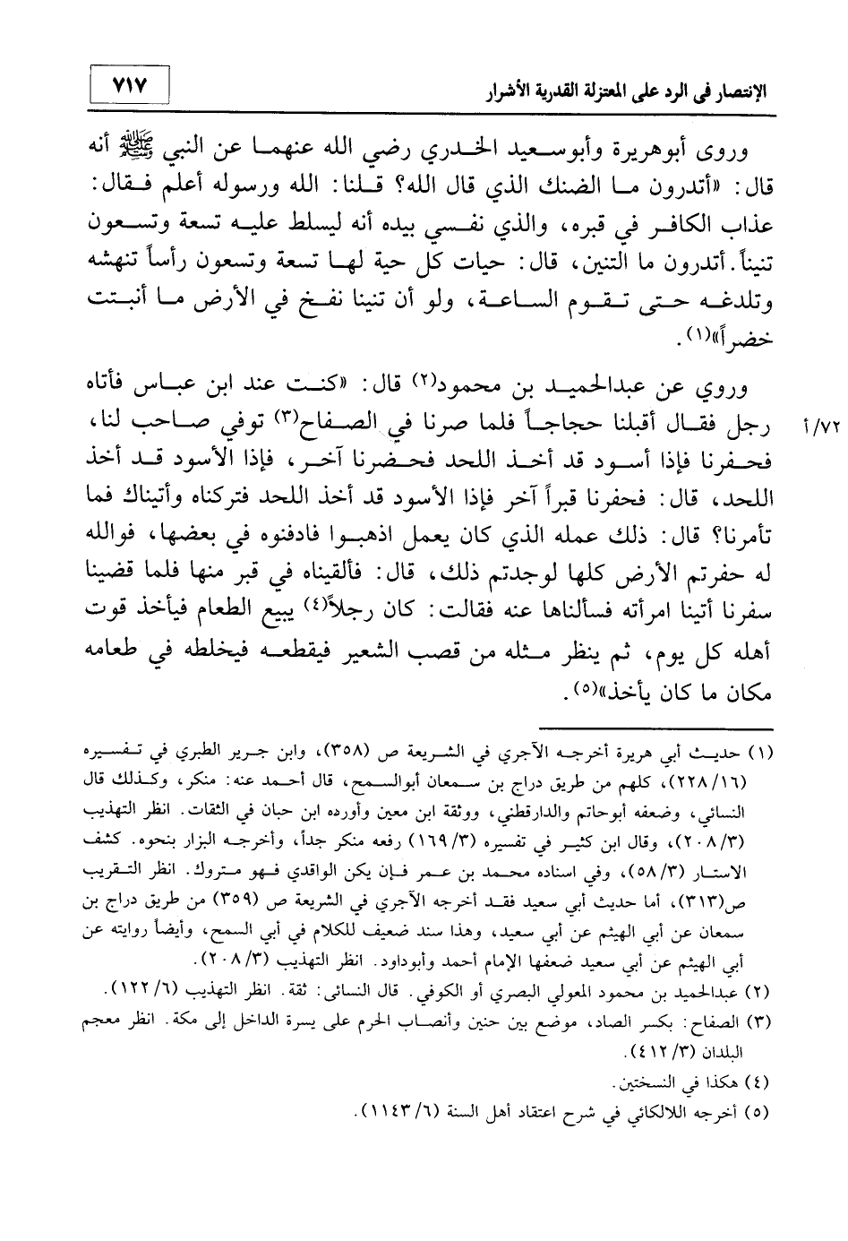 1 حديث أبي هريرة أخرجه الآجري في الشريعة ص 358، وابن جرير الطبري في تفسيره 16/228، كلهم من طريق دراج بن سمعان أبو السمح، قال أحمد عنه: "منكر"، وكذلك قال النسائي، وضعفه أبو حاتم والدارقطني، ووثقه ابن معين وأورده ابن حبان في الثقات. انظر: التهذيب 3/208، وقال ابن كثير في تفسيره 3/169: "رفعه منكر جداً"، وأخرجه البزار بنحوه. كشف الأستار 3/58، وفي إسناده محمد بن عمر فإن يكن الواقدي فهو متروك. انظر: دراج بن أبي الهيثم عن أبي الهيثم عن أبي سعيد، وهذا سند ضعيف للكلام في ابي السمح، وأيضاً روايته عن أبي الهيثم عن أبي سعيد ضعفها الإمام أحمد وأبو داود. انظر: التهذيب 3/208.
