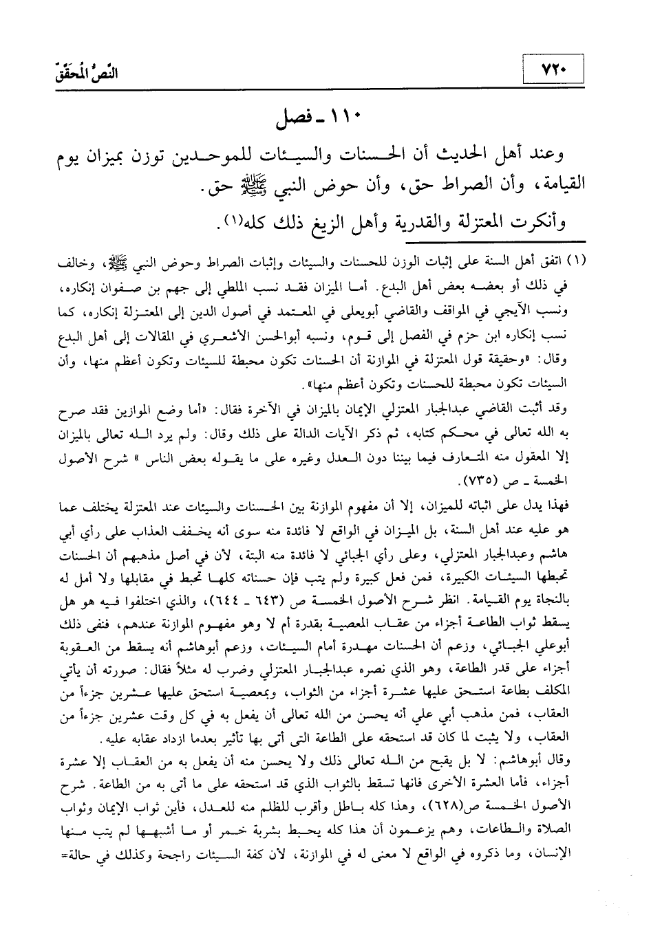 فهذا يدل على إثباته للميزان، إلا أن مفهوم الموازنة بين الحسنات والسيئات عند المعتزلة يختلف هو عليه عند أهل السنة، بل الميزان في الواقع لا فائدة منه سوى أنه يخفف العذاب على رأي أبي هاشم وعبد الجبار المعتزلي، وعلى رأي الجبائي لا فائدة منه البتة، لأن في أصل مذهبهم أن الحسنات تحبطها السيئات الكبيرة، فمن فعل كبيرة ولم يتب فإن حسناته كلها تحبط في مقابلها ولا أمل له بالنجاة يوم القيامة. انظر: شرح الأصول الخمسة ص 643 - 644، والذي اختلفوا فيه هو هل يسقط ثواب الطاعة أجزاءه من عقاب المعصية بقدرة أم لا وهو مفهوم الموازنة عندهم، فنفى ذلك أبو علي الجبائي، وزعم أن الحسنات مهدرة أمام السيئات، وزعم أبو هاشم أنه يسقط من العقوبة أجزاء على قدر الطاعة، وهو الذي نصره عبد الجبار المعتزلي وضرب له مثلاً فقال: صورته أن يأتي المكلف بطاعة استحق عليها عشرة أجزاء من الثواب، وبمعصية استحق عليها عشرين جزءاً من العقاب، فمن مذهب أبي علي أنه يحسن من الله تعالى أن يفعل به في كل وقت عشرين جزءاً من العقاب، ولا يثبت لما كان قد استحقه على الطاعة التي أتى بها تأثير بعد ما ازداد عقابه عليه.