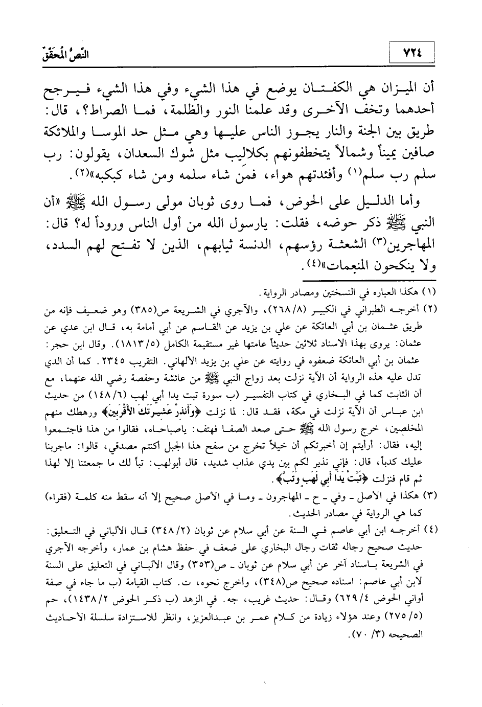 4 أخرجه ابن أبي عاصم في السنة عن أبي سلام عن ثوبان 2/348 قال الألباني في التعليق: "حديث صحيح رجاله ثقات رجال البخاري على ضعف في حفظ هشام بن عمار"، وأخرجه الآجري في الشريعة بإسناد آخر عن أبي سلام عن ثوبان - ص 353 وقال الألباني في التعليق على السنة لابن أبي عاصم: إسناده صحيح ص 348، وأخرج نحوه، ت. كتاب القيامة (ب ما جاء في صفة أواني الحوض 4/629 وقال: حديث غريب، جه. في الزهد (ب ذكر الحوض) 2/1438،حم 5/275 وعند هؤلاء زيادة من كلام عمر بن عبد العزيز، وانظر: للاستزادة سلسلة الأحاديث الصحيحة 3/70.