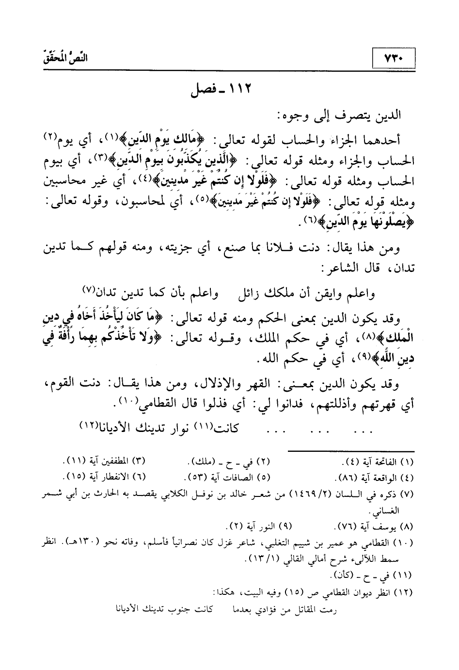 أحدهما الجزاء والحساب لقوله تعالى: {مَالِكِ يَوْمِ الدِّينِ} 1، أي يوم2 الحساب والجزاء ومثله قوله تعالى: {الَّذِينَ يُكَذِّبُونَ بِيَوْمِ الدِّينِ} 3، أي بيوم الحساب ومثله قوله تعالى: {فَلَوْلا إِنْ كُنْتُمْ غَيْرَ مَدِينِينَ} 4، أي غير محاسبين ومثله قوله تعالى: {فَلَوْلا إِنْ كُنْتُمْ غَيْرَ مَدِينِينَ} 5، أي لمحاسبون، وقوله تعالى: {يَصْلَوْنَهَا يَوْمَ الدِّينِ} 6.