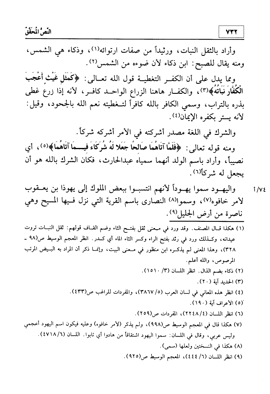 وأراد بالثقل النبات، ورثيداً من صفات ارتوائه1، وذكاء هي الشمس ومنه يقال للصبح: ابن ذكاء لأن وضوءه من الشمس2.ومما يدل على أن الكفر التغطية قول الله تعالى: {كَمَثَلِ غَيْثٍ أَعْجَبَ الْكُفَّارَ نَبَاتُهُ} 3، والكفار هاهنا الزراع الواحد كافر، لأنه إذا زرع غطى بذره بالتراب، وسمي الكافر بالله كافراً لتغطية نعم الله بالجحود، وقيل: لأنه يستر بكفره الإيمان4.والشرك في اللغة مصدر أشركته في الأمر أشركه شركاً, ومنه قوله تعالى: {فَلَمَّا آتَاهُمَا صَالِحاً جَعَلا لَهُ شُرَكَاءَ فِيمَا آتَاهُمَا} 5، أي نصيباً، وأراد باسم الولد أنهما سمياه عبد الحارث، فكان الشرك بالله هو أن يجعل له شركاً6.