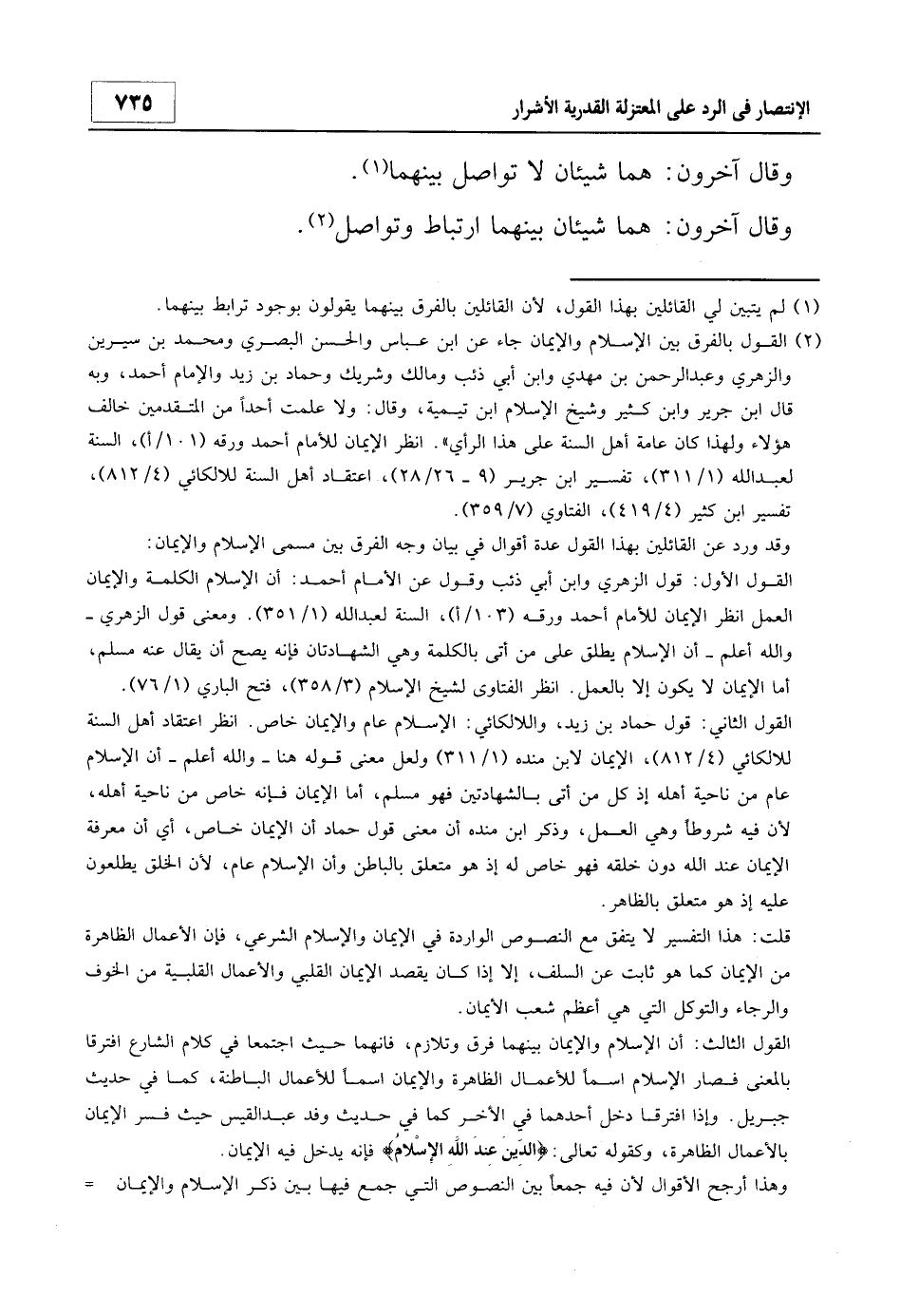 وهذا أرجح الأقوال لأن فيه جمعاً بين النصوص التي جمع فيها بين ذكر الإسلام والإيمان والنصوص التي أفرد فيها أحدهما عن الآخر، وقد ذكر هذا القول جماعة من العلماء ورجحوه. انظر: قول الخطابي في معالم السنن بهامش مختصر أبي داود 7/49، وانظر: شرح مسلم للنووي وقول المصنف هنا "بينهما ارتباط وتواصل" يعني بذلك انه لا يصح إيمان إلا بإسلام ولا إسلام إلا بإيمان.