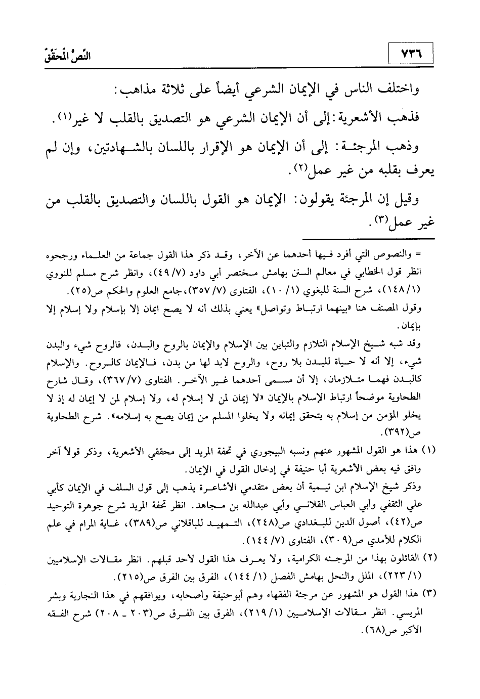 1 هذا هو القول المشهور عنهم ونسبه البيجوري في تحفة المريد إلى محققي الأشعرية، وذكر قولا آخر وافق فيه بعض الأشعرية أبا حنيفة في إدخال القول بالإيمان.