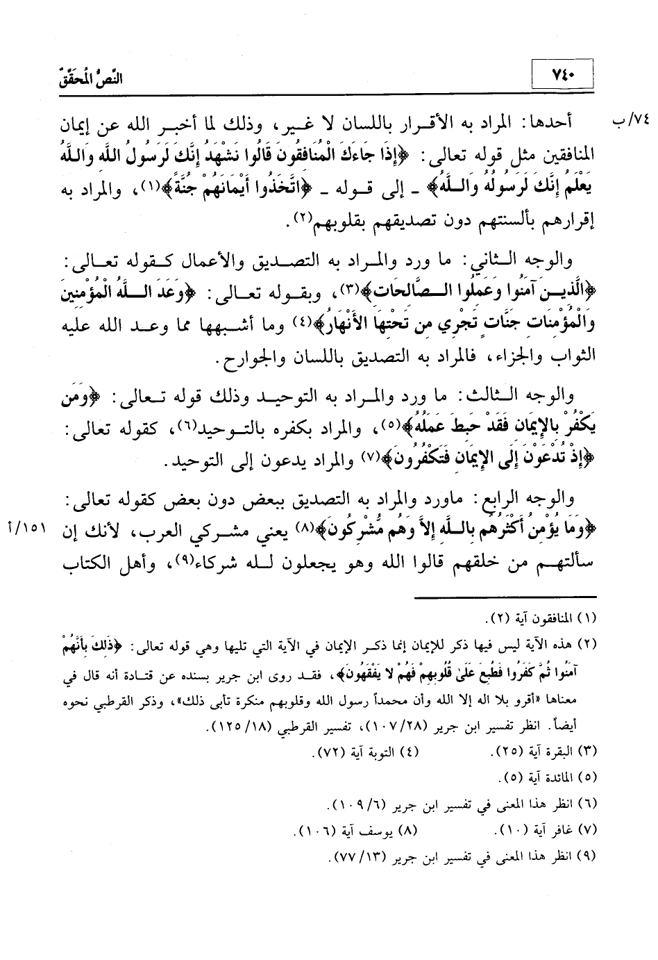 والوجه الرابع: ما ورد والمراد به به التصديق ببعض دون بعض كقوله تعالى: {وَمَا يُؤْمِنُ أَكْثَرُهُمْ بِاللَّهِ إِلاّ وَهُمْ مُشْرِكُونَ} 8 يعني مشركي العرب، لأنك إن سألتهم من خلقهم قالوا الله وهم يجعلون لله شركاء9، وأهل الكتاب