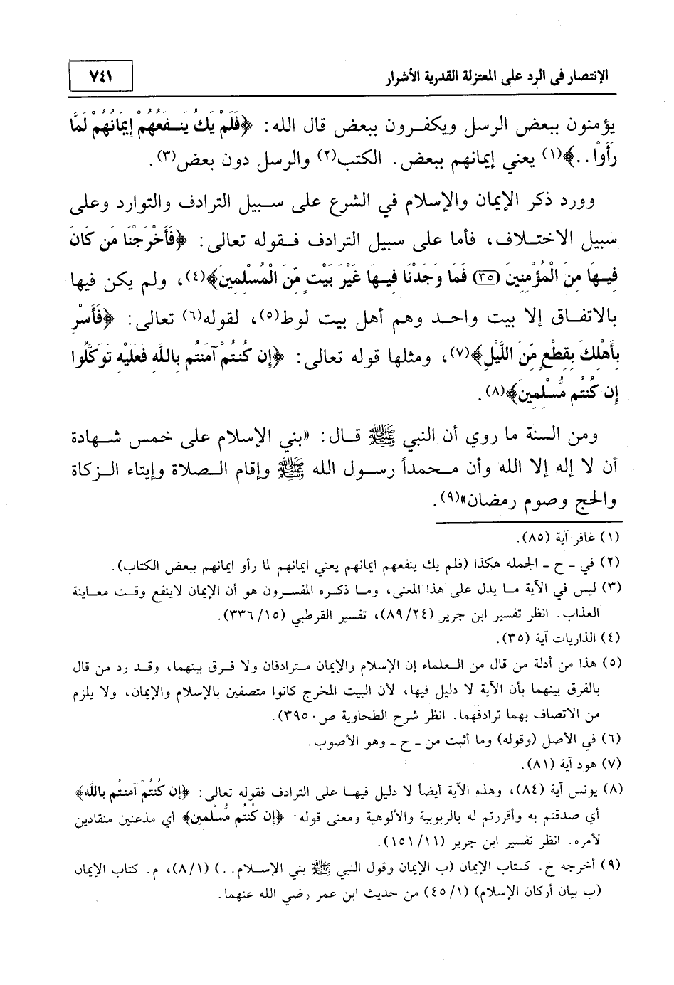 وورد ذكر الإيمان والإسلام في الشرع على سبيل الترادف والتوارد وعلى سبيل الاختلاف، فأما على سبيل الترادف فقوله تعالى: {فَأَخْرَجْنَا مَنْ كَانَ فِيهَا مِنَ الْمُؤْمِنِينَ، فَمَا وَجَدْنَا فِيهَا غَيْرَ بَيْتٍ مِنَ الْمُسْلِمِينَ} 4، ولم يكن فيها بالاتفاق إلا بيت واحد وهم أهل بيت لوط5، لقوله6 تعالى: {فَأَسْرِ بِأَهْلِكَ بِقِطْعٍ مِنَ اللَّيْلِ} 7 ومثلها قوله تعالى: {إِنْ كُنْتُمْ آمَنْتُمْ بِاللَّهِ فَعَلَيْهِ تَوَكَّلُوا إِنْ كُنْتُمْ مُسْلِمِينَ} 8.