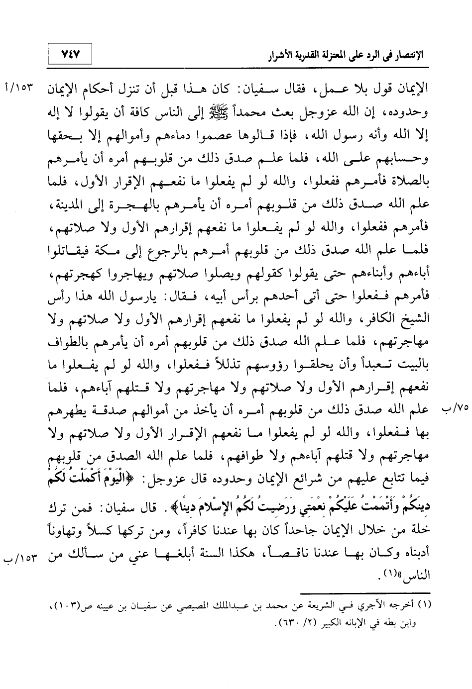1 أخرجه الآجري في الشريعة عن محمد بن عبد الملك المصيصي عن سفيان بن عيينة ص 103، وابن بطة في الإبانة الكبير 2/630.