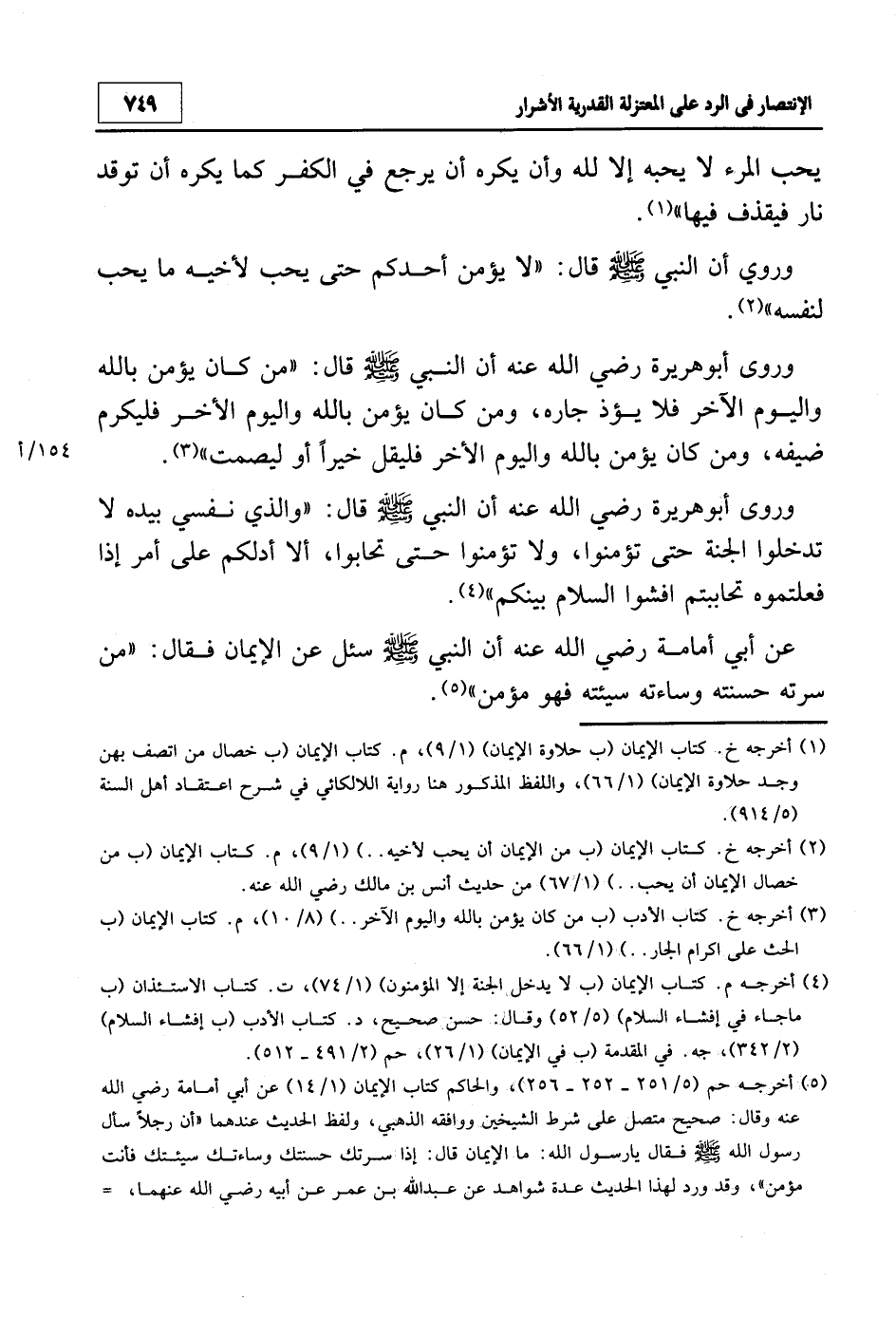 1 أخرجه خ. كتاب الإيمان (ب حلاوة الإيمان) 1/9، م. كتاب الإيمان (ب خصال من اتصف بهن وجد حلاوة الإيمان) 1/66، واللفظ المذكور هنا رواية اللالكائي في شرح اعتقاد أهل السنة 5/914.
