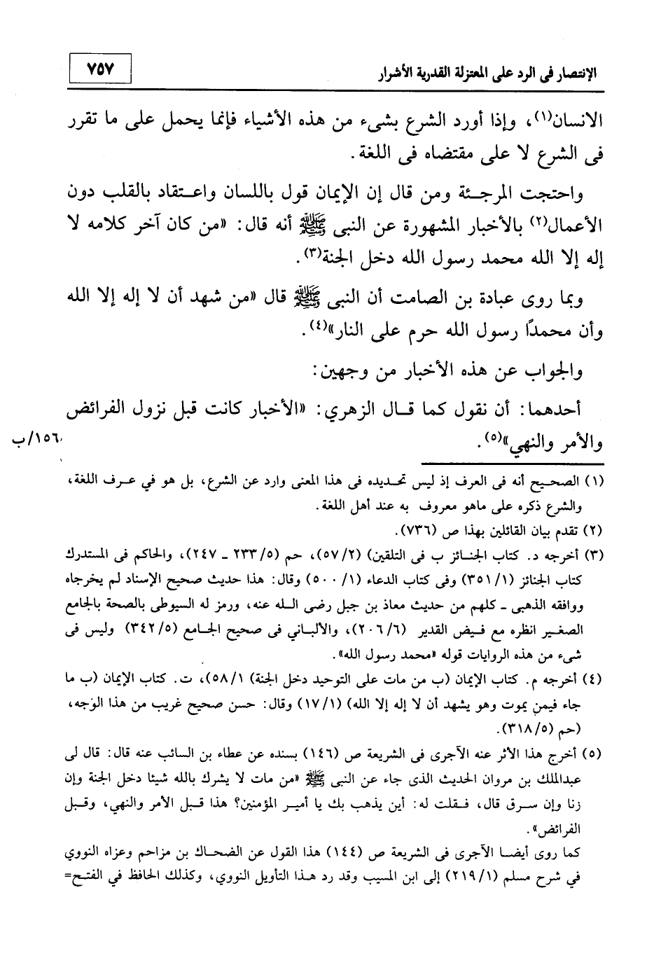 واحتجت المرجئة ومن قال إن الإيمان قول باللسان واعتقاد بالقلب دون الأعمال2 بالأخبار المشهورة عن النبي صلى الله عليه وسلم أنه قال: " من كان آخر كلامه لا إله إلا الله محمد رسول الله دخل الجنة" 3.